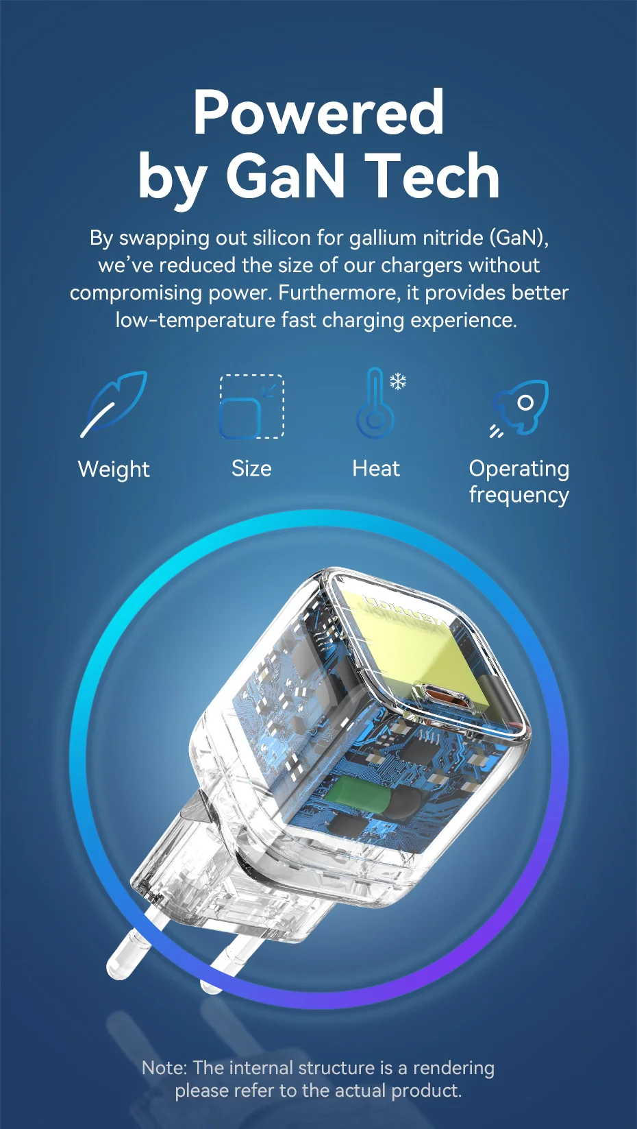 Al cambiar el silicio por nitruro de galio (GaN), hemos reducido el tamaño de nuestros cargadores sin comprometer la potencia. Además, proporciona una mejor experiencia de carga rápida a baja temperatura.