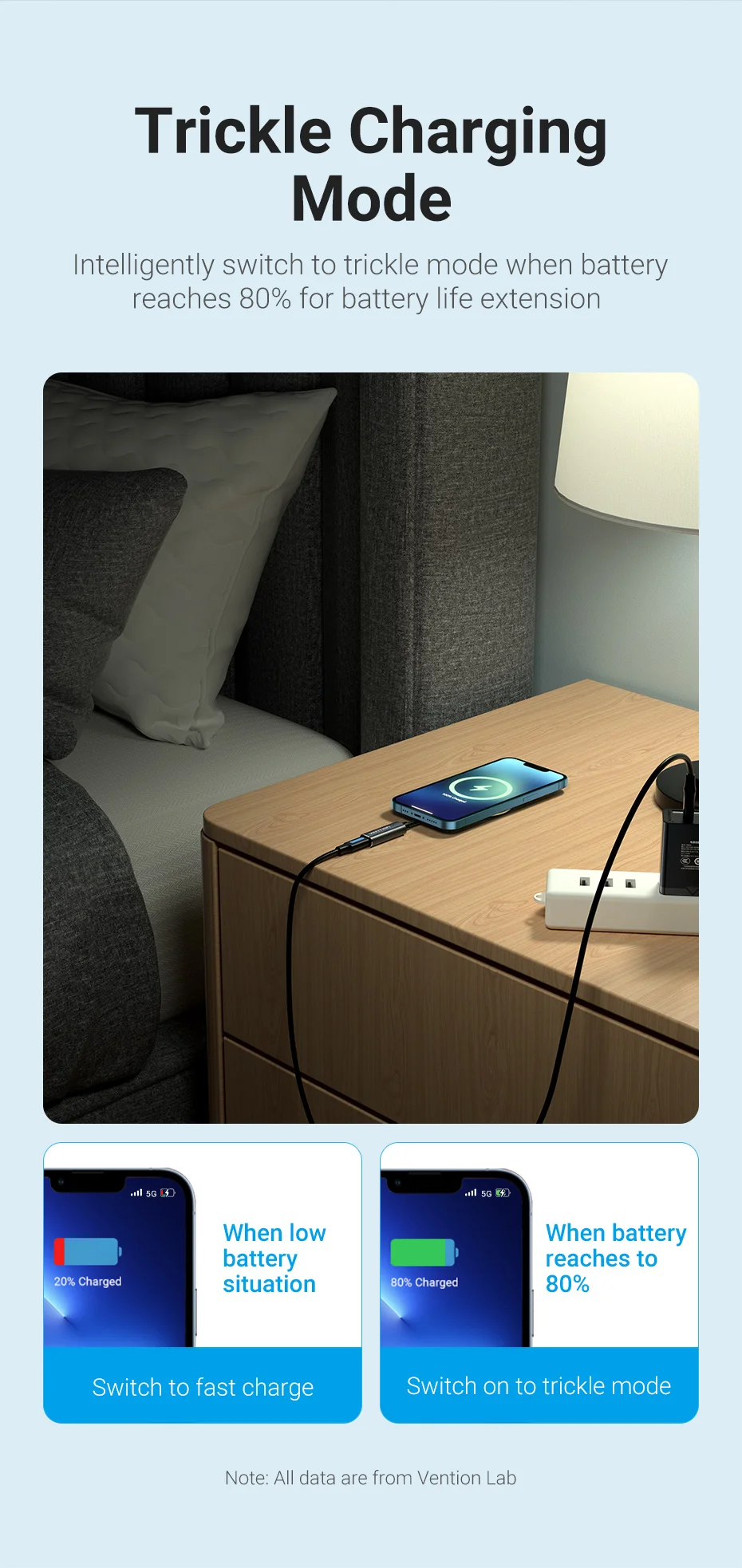 Cambia de forma inteligente al modo de goteo cuando la batería alcanza el 80% para la extensión de la vida útil de la batería