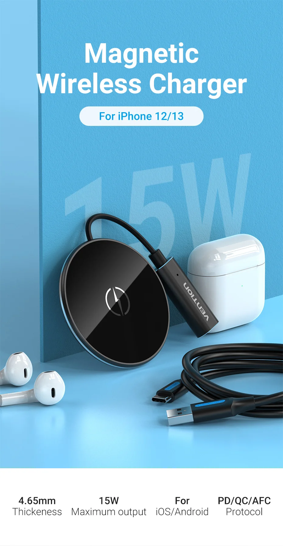 Comprar Vention-cargador inalámbrico magnético para iPhone, dispositivo de inducción magnética para AirPods Pro, Xiaomi, Huawei, 15W
