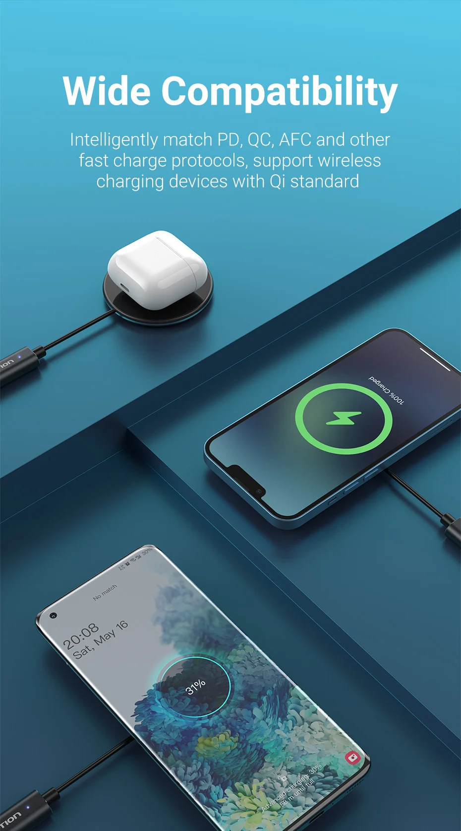 Combina de forma inteligente con PD.QC.AFC y otros protocolos de carga rápida, admite dispositivos de carga inalámbrica con el estándar Qi.