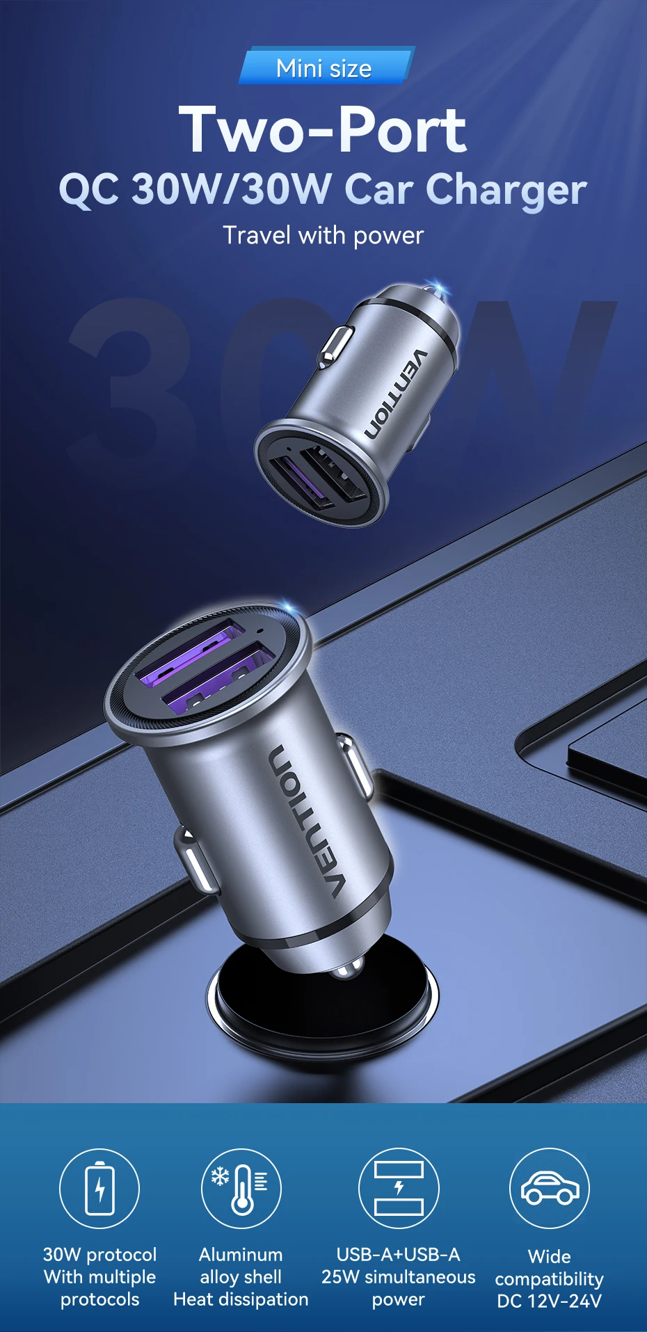 Dos puertos QC 30W cargador de coche