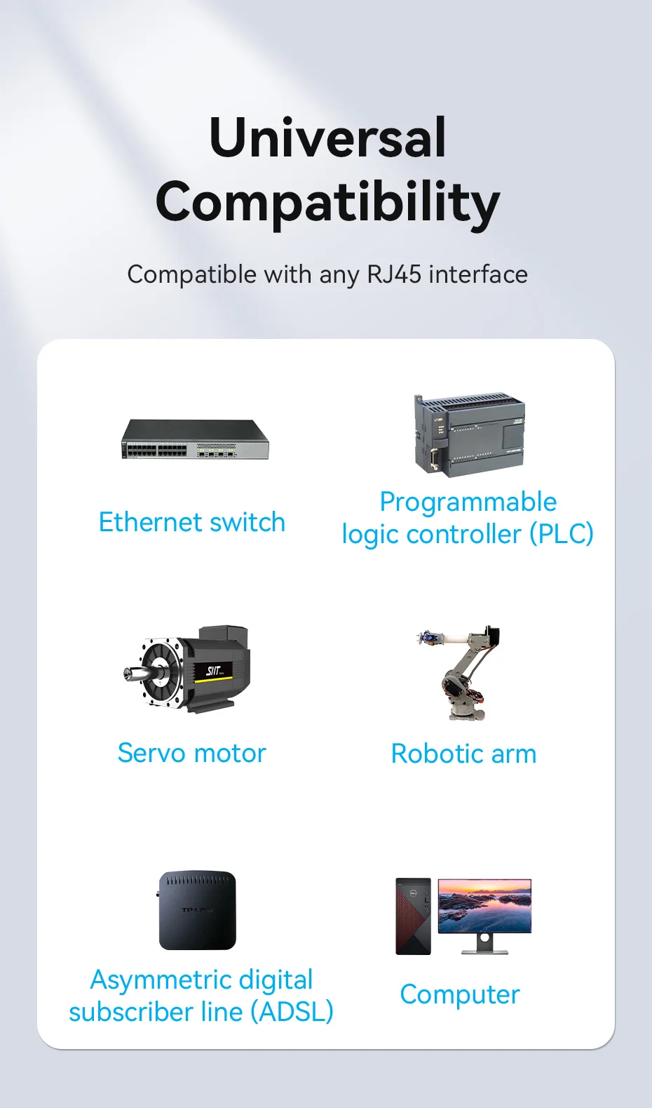 Proporciona conectividad universal para componentes de red LAN como conmutador Ethernet, PLC, servomotor, brazo robótico, ADSL, etc.