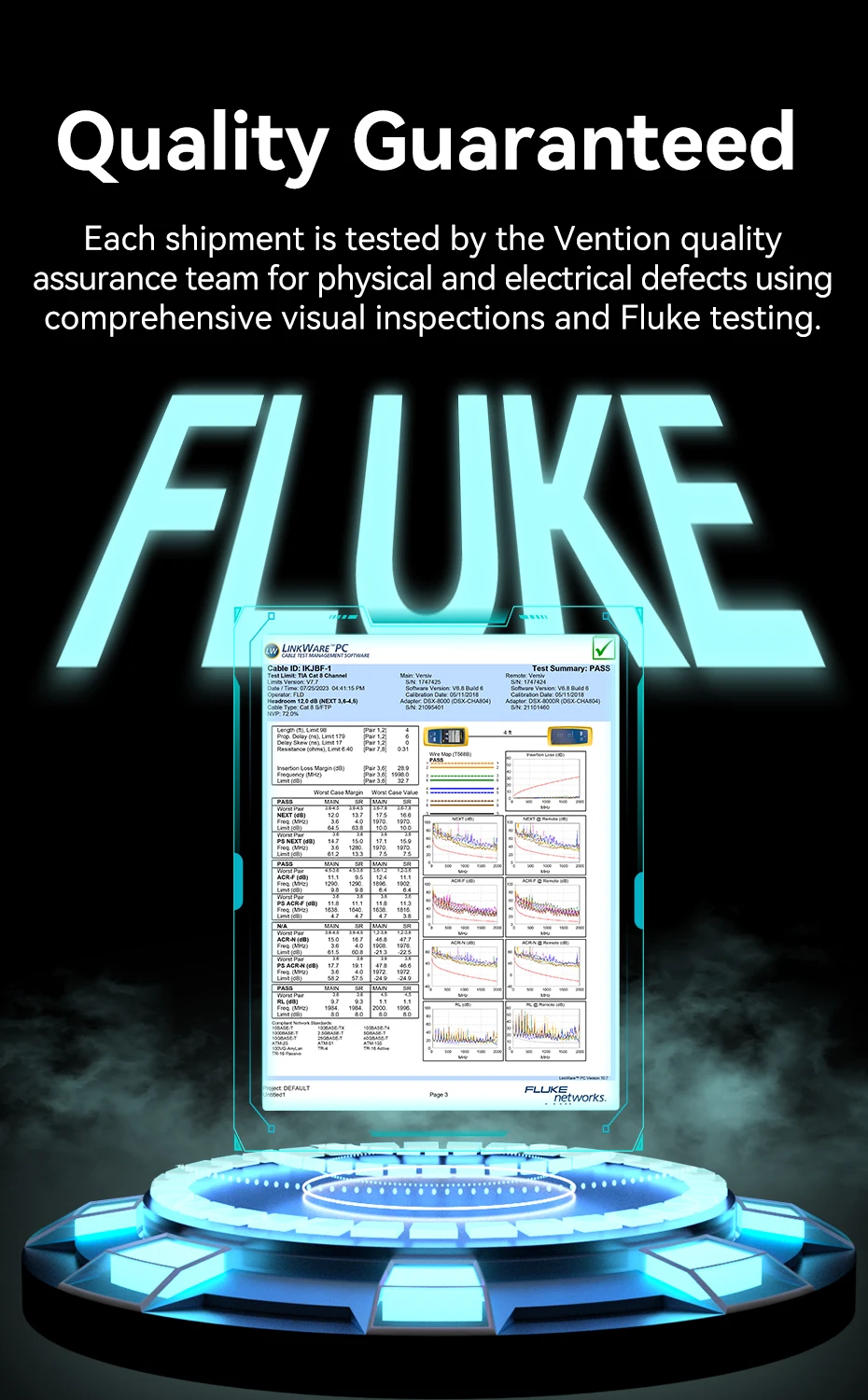 Cada envío es probado por el equipo de garantía de calidad de Vention para detectar defectos físicos y eléctricos utilizando inspecciones visuales integrales y pruebas de Fluke.