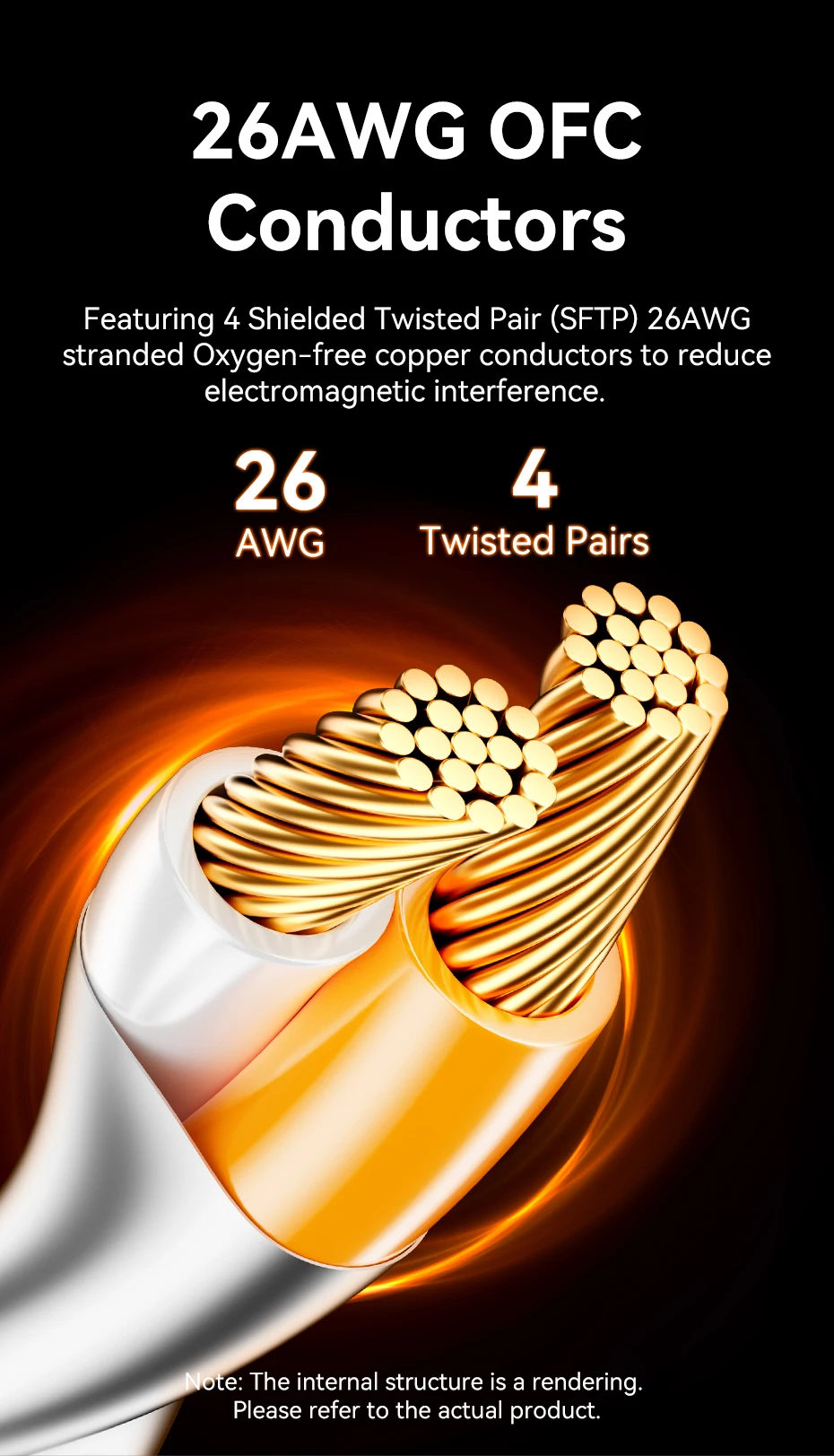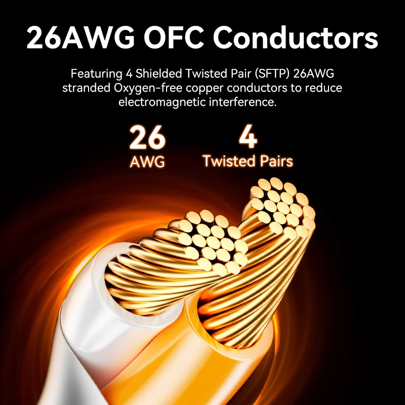 Con 4 conductores de cobre sin oxígeno trenzados de 26 AWG de par trenzado (SFTP) para reducir la interferencia electromagnética.