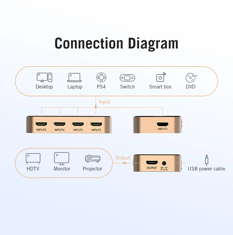 HDMI 5 in 1 out switcher provides a way to switch among multiple HDMI sources, like Laptop, HD-DVD, PS3, Xbox360 to a HDMI TV or display. It allows the switching of 5 inputs and maintains all signal components present within the encoded signal HDCP encryption. You could easily select from different programme sources via front panel push buttons or IR remote control without moving cables around.