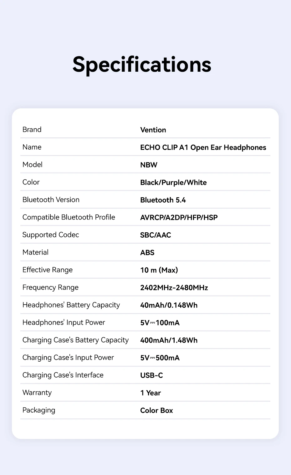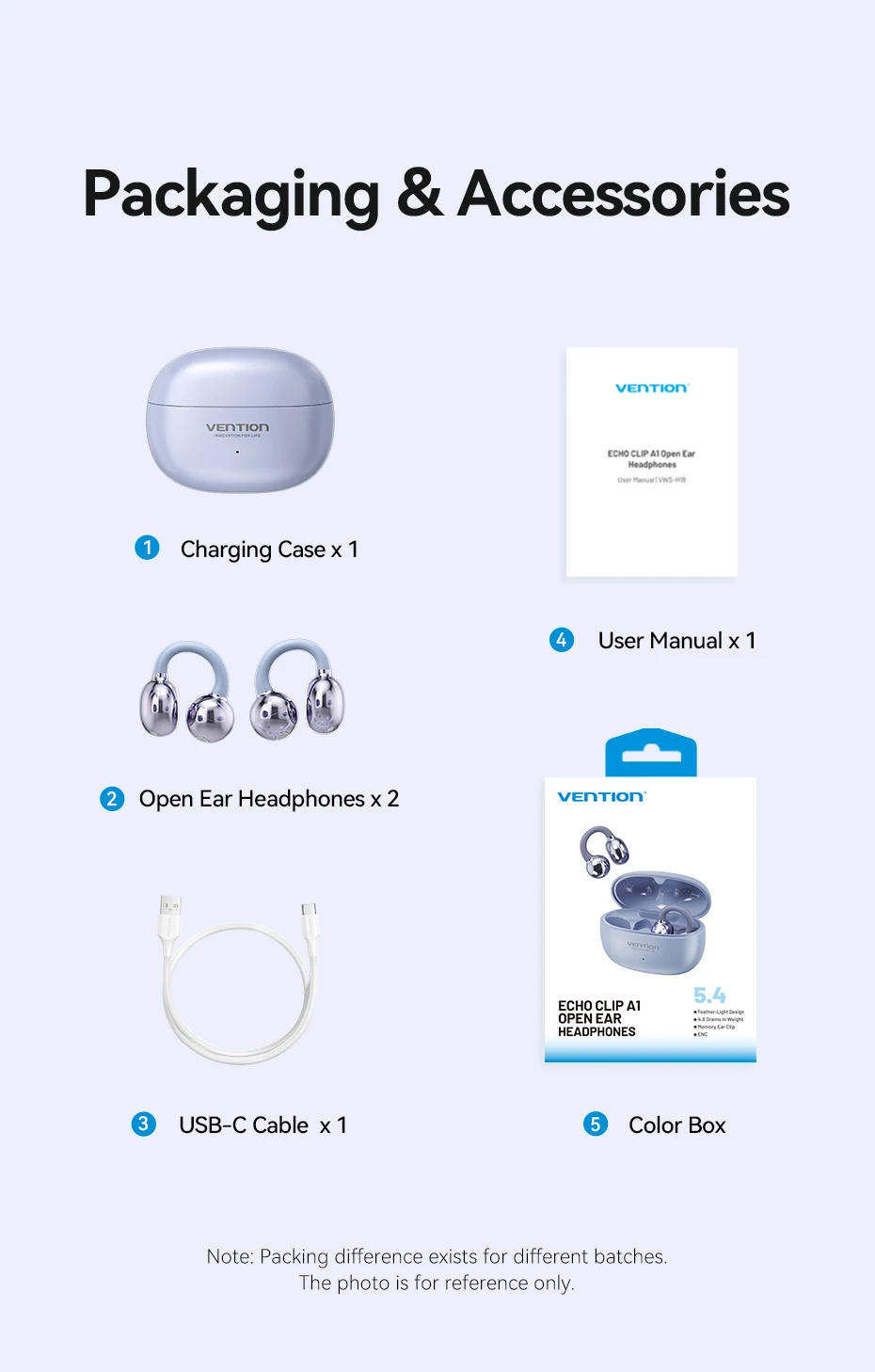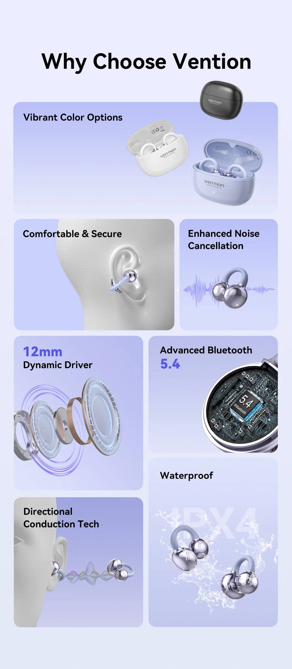 Vention ECHO CLIP A1 Auriculares inalámbricos con clip de oreja abierta Bluetooth 5,4 ENC Auriculares deportivos con micrófono con ganchos para la oreja y gancho para la oreja