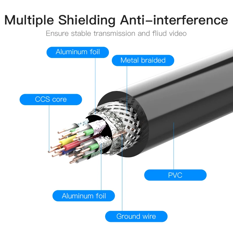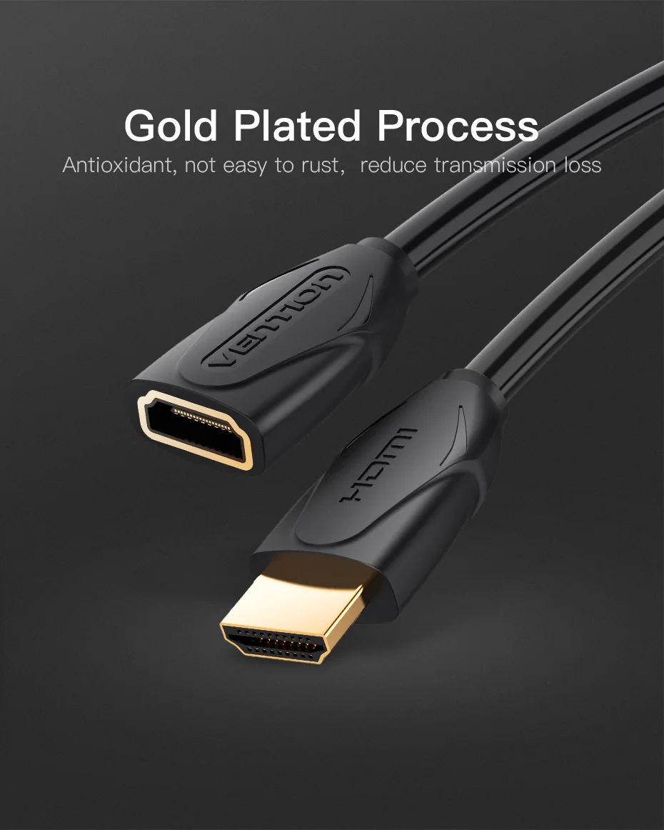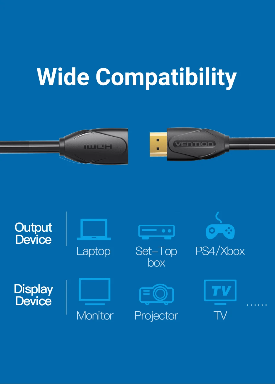 El cable de extensión HDMI Vention extiende un cable HDMI corto para conectar cualquier dispositivo HDMI estándar.
