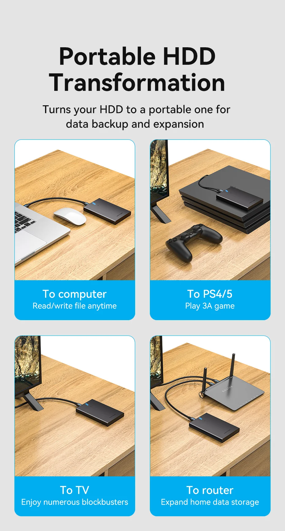 1)Carcasa de disco duro externo de 2,5 ": Conecta fácilmente su SSD y HDD de 2,5 pulgadas a PC, portátil, PS4, Xbox para transferencia de datos o ampliación de almacenamiento. Protege el disco duro de arañazos externos y hace que el disco duro SATA sea portátil para el almacenamiento de datos.