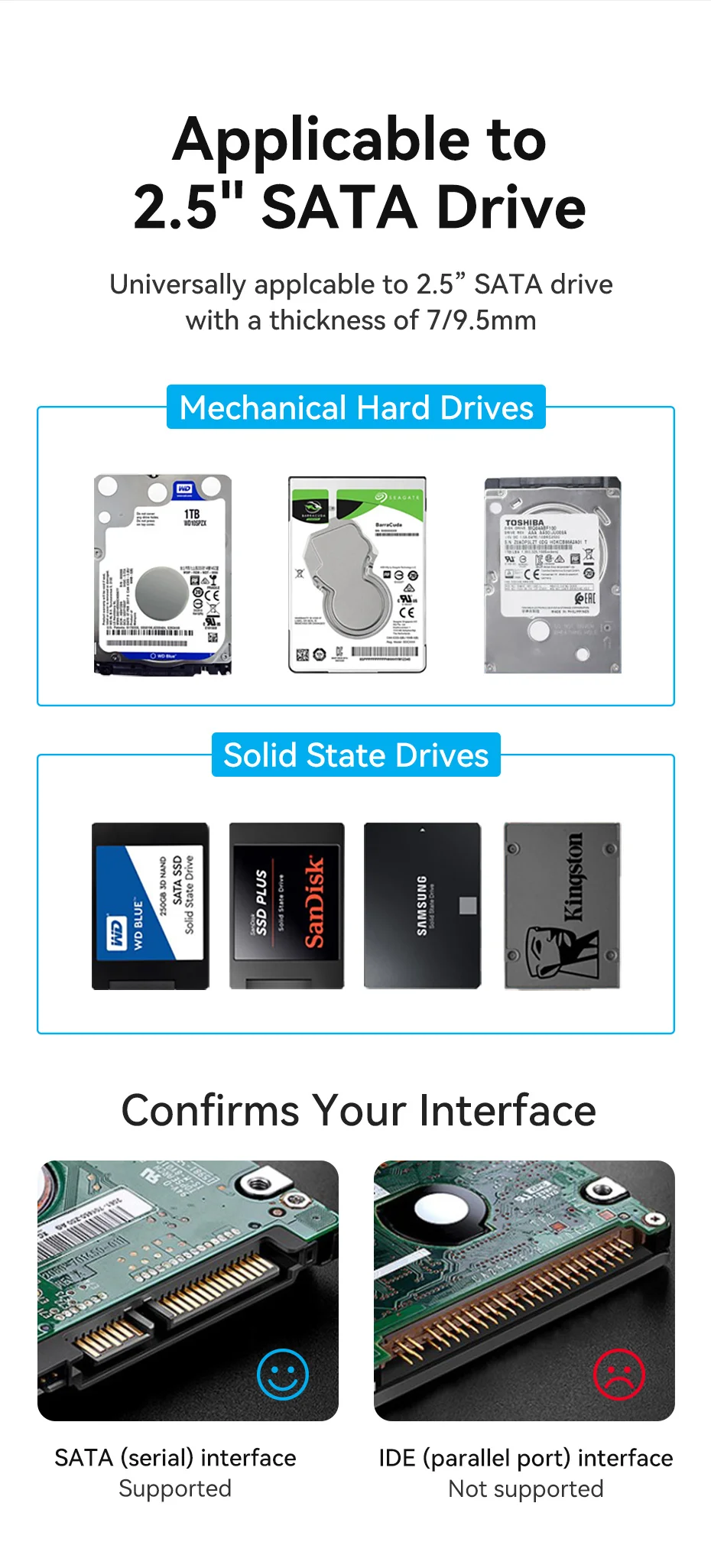 4) Compatibilidad Universal: compatible con sistemas Windows, LINUX, Mac OS 8,0 y superiores. Diseñado para 2,5 pulgadas 7mm/9,5mm SATA HDD y SSD hasta 6TB. Compatible con WD, Seagate, Toshiba, Hitachi, Samsung, Crucial, SSD y HDD con puerto SATA, etc.