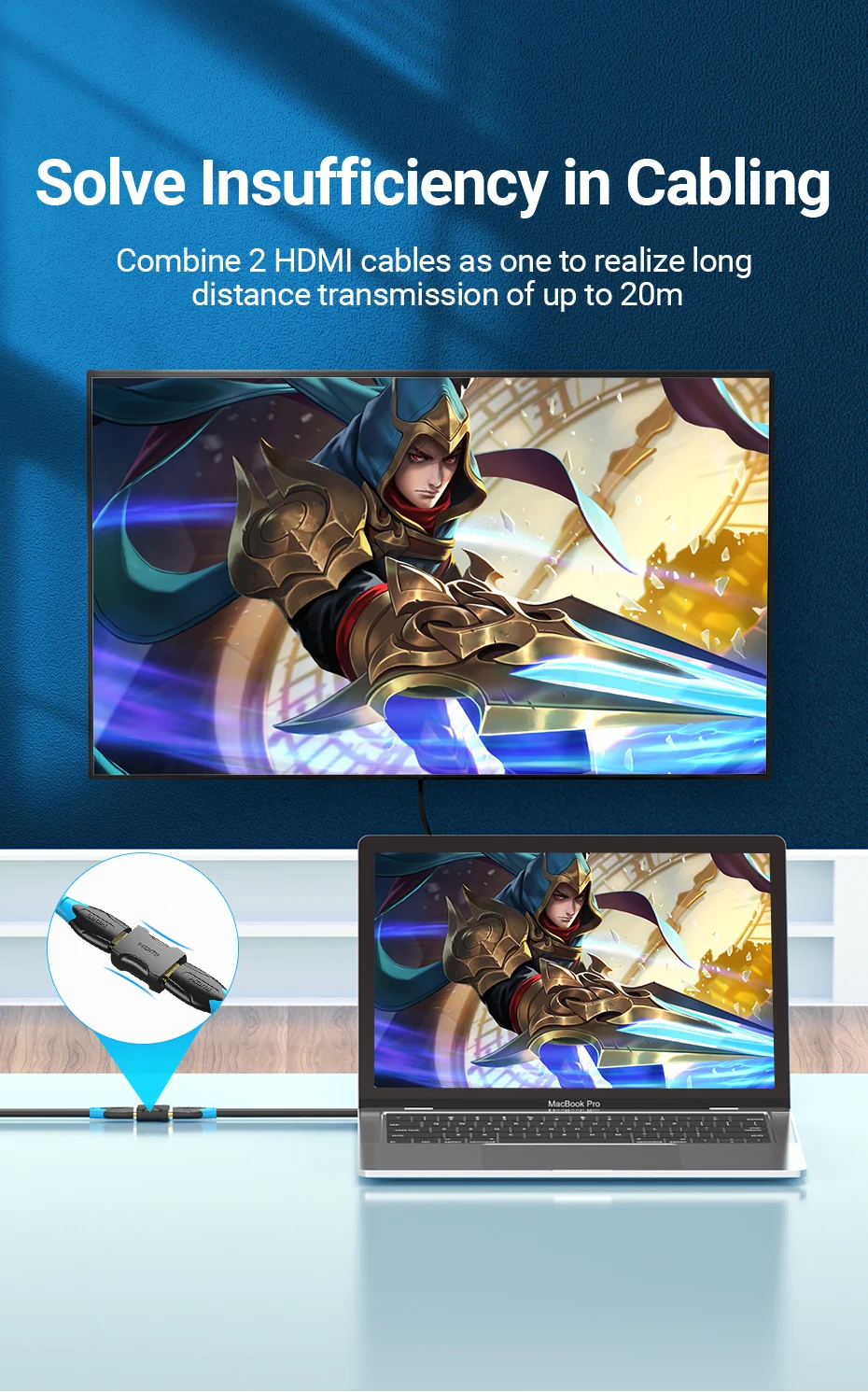Conecta fácilmente 2 cables HDMI en 1 cable HDMI para fines de extensión de larga distancia y gira el puerto HDMI macho a Puerto hembra para conectar otros dispositivos 。