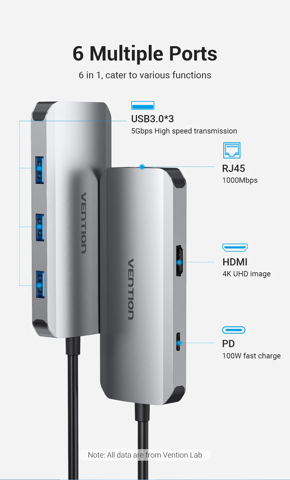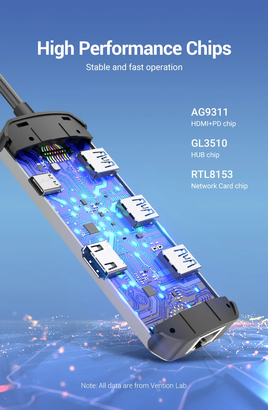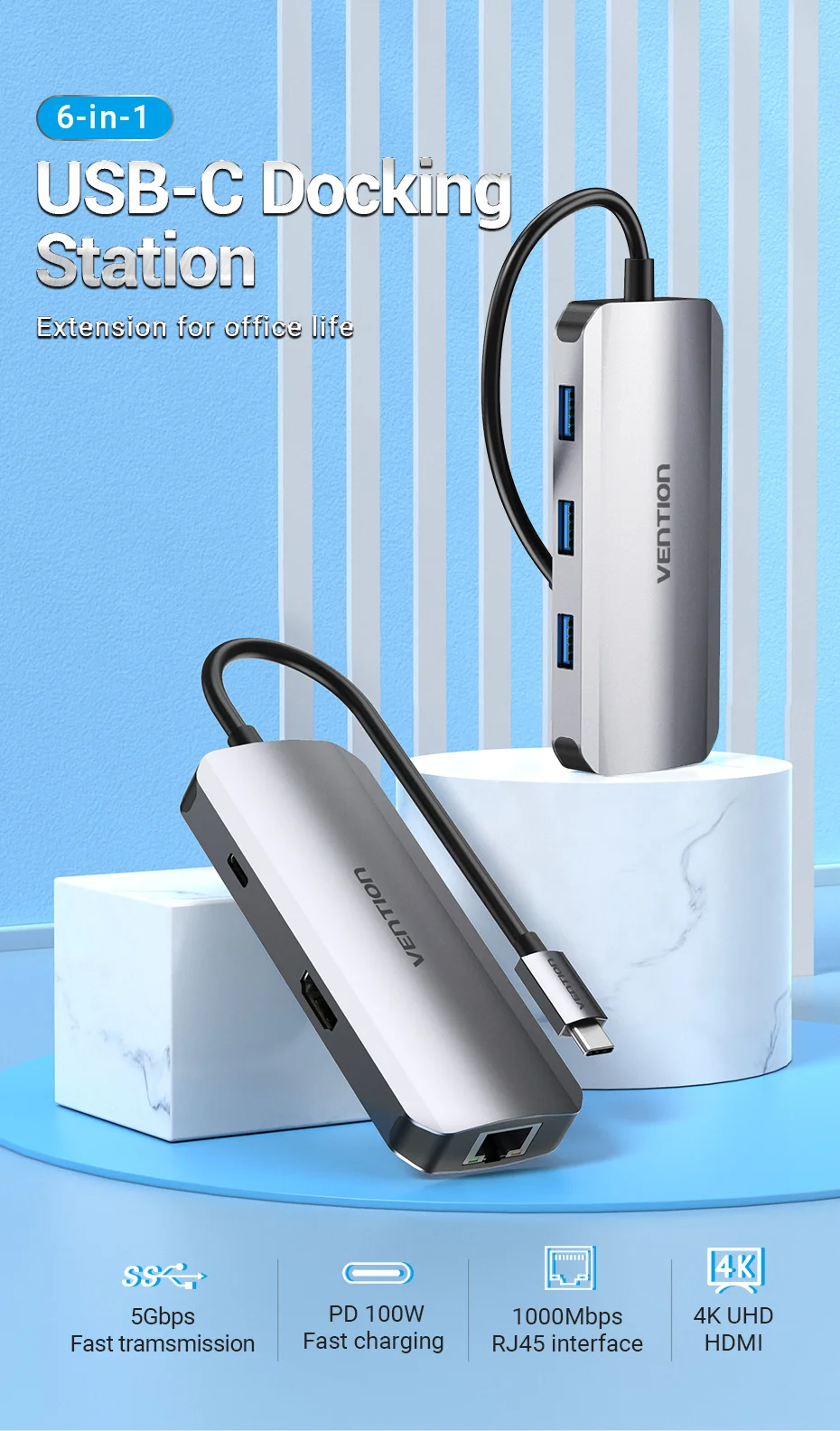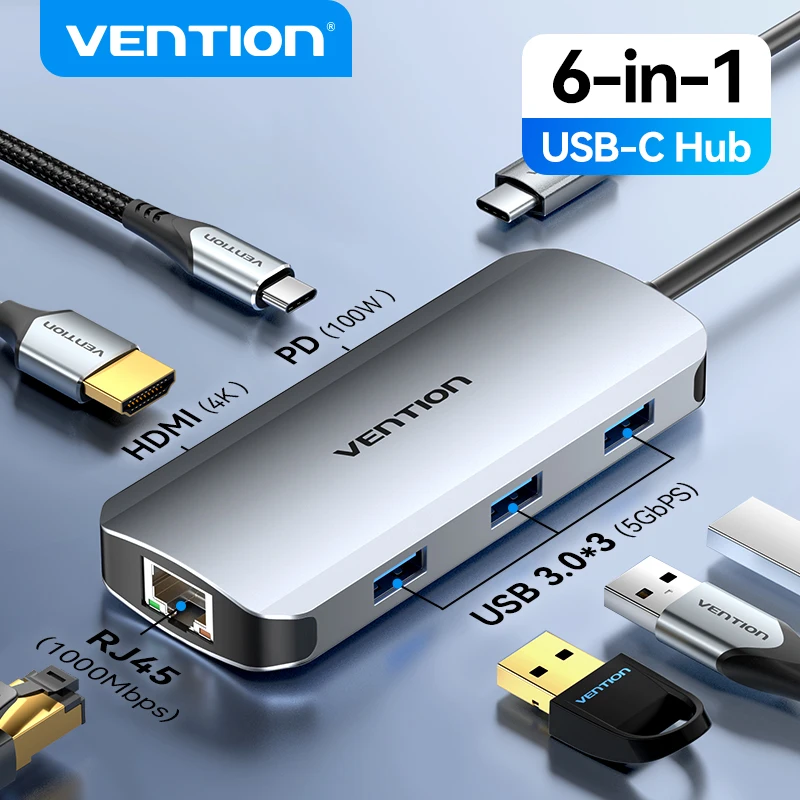 Comprar Vention-HUB USB C 6 en 1 a HDMI, USB 3,0, RJ45, PD100W, divisor USB para ordenador portátil, Macbook Pro Air, iPad, teléfono, estación de acoplamiento Android