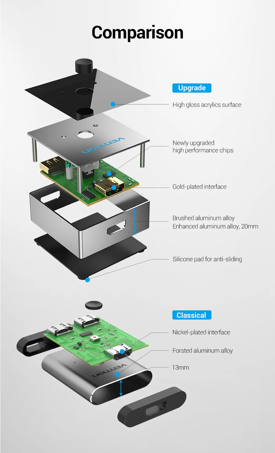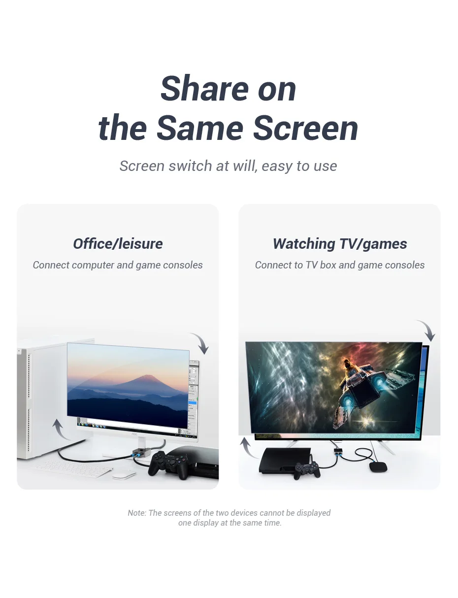 2 construcción de aleación de aluminio sólido, el divisor bidireccional HDMI duradero te ayuda a conectar dos fuentes HDMI a una pantalla HDMI o conecta una fuente HDMI para cambiar entre dos pantallas (dos pantallas no se pueden mostrar simultáneamente).