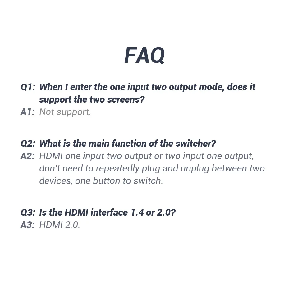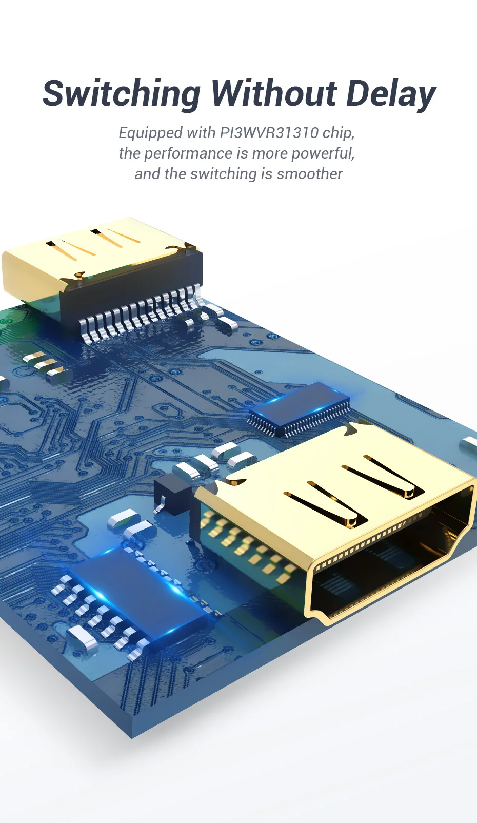 3. El interruptor HDMI proporciona un ancho de banda alto transmisión de datos 18Gbps, sin retraso, sin pérdida de calidad de imagen o sonido. (Cable HDMI no incluido)
