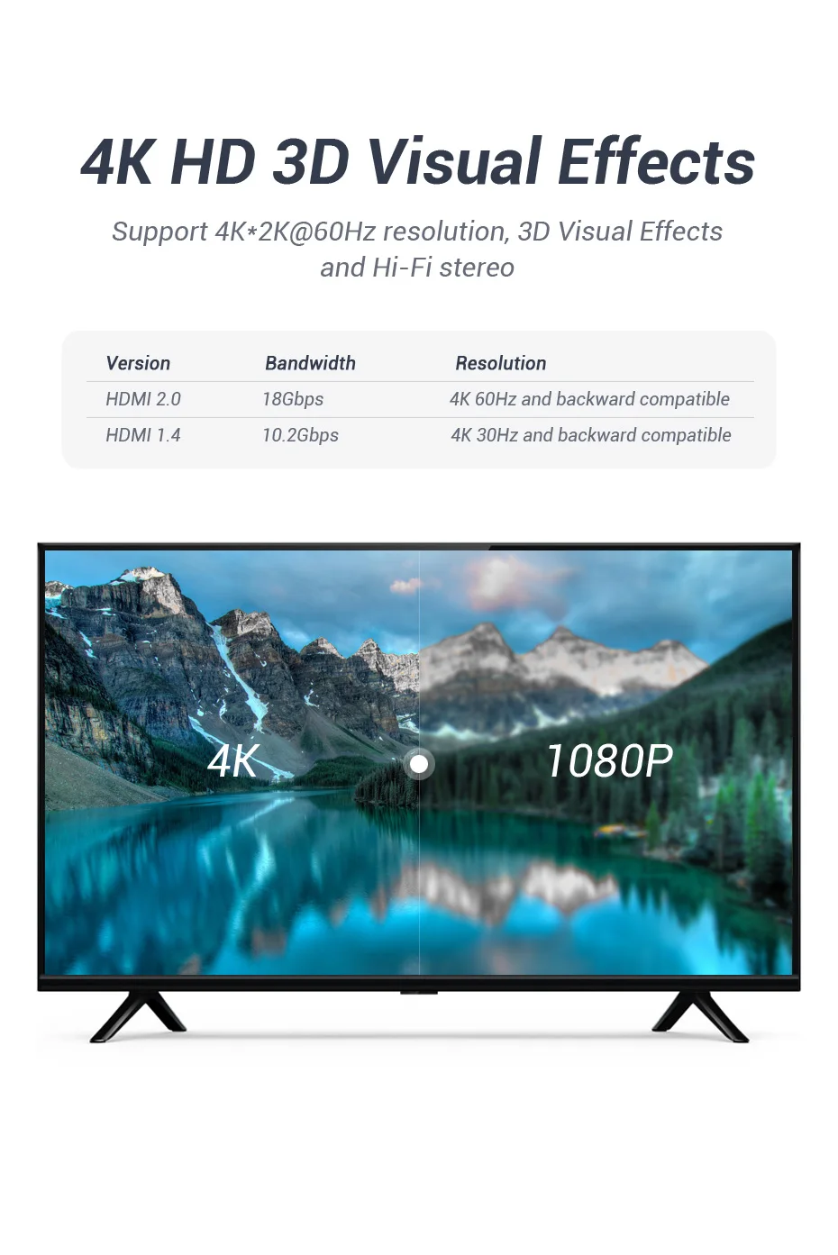 4. 3D admite audio, 4K x 2K @ 60hz 1080P @ 60Hz, resolución y HD, con este interruptor HDMI puedes disfrutar del vídeo y audio más lujoso. (Utiliza cables HDMI 2,0 estándar para conectar)