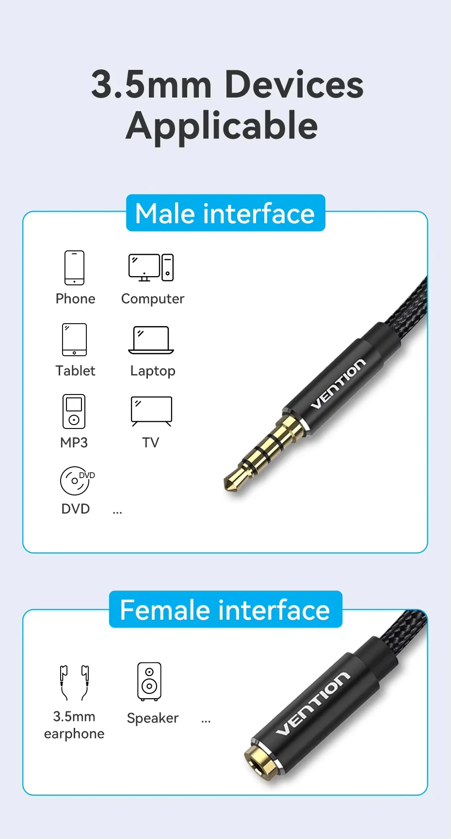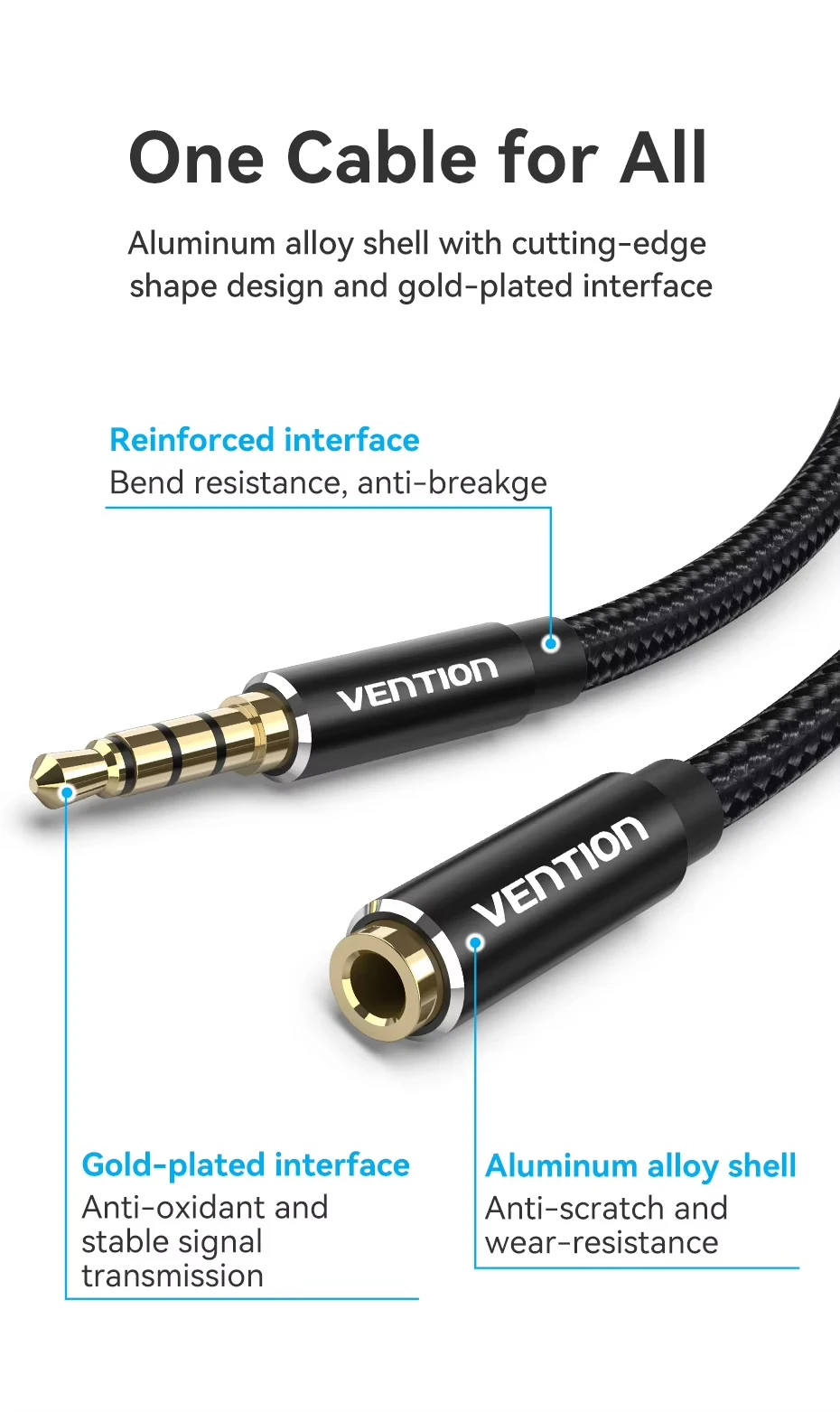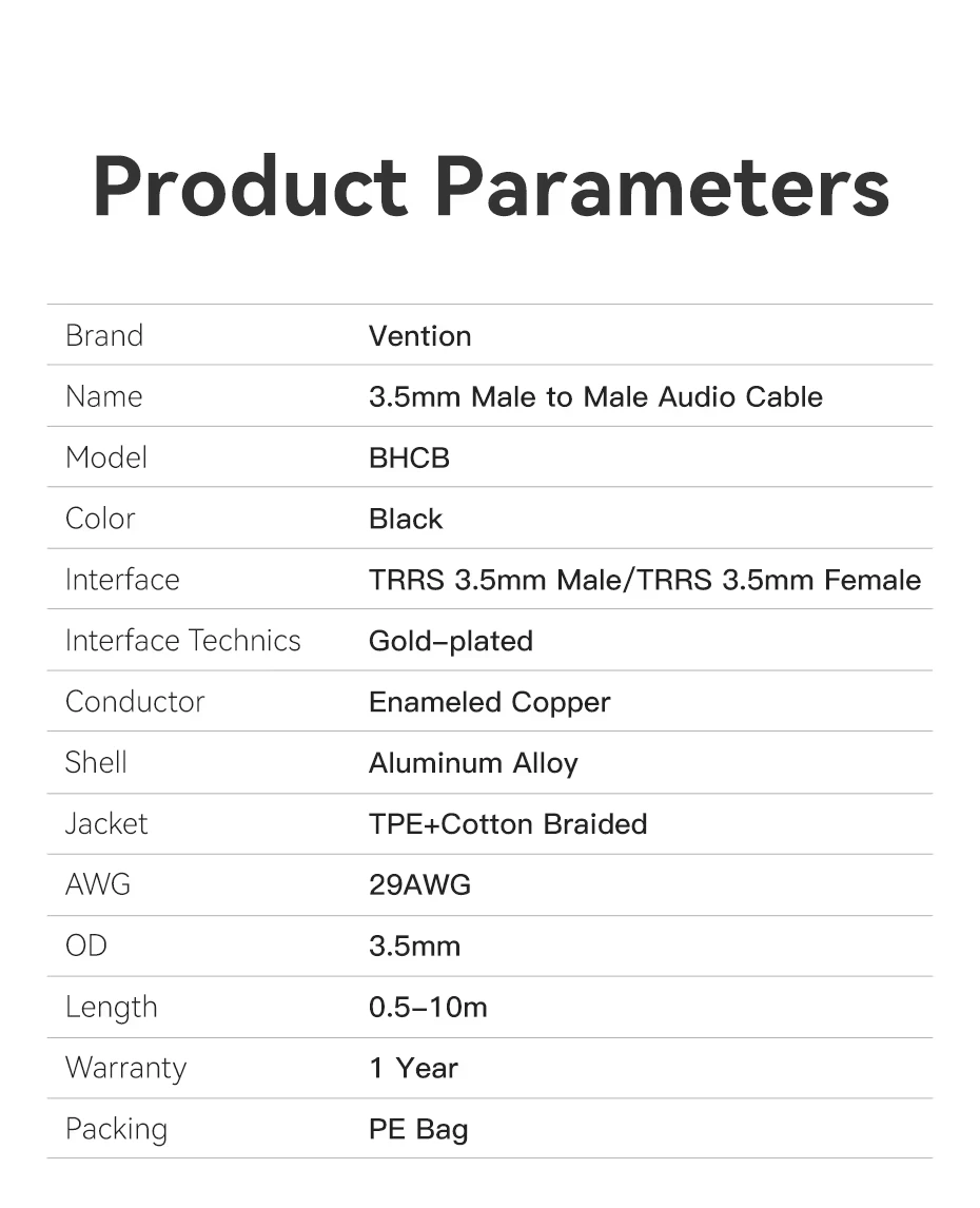 Cable de extensión para auriculares Vention, conector de 3,5mm, Cable auxiliar de Audio para auriculares Xiaomi Redmi 5 plus PC, Cable auxiliar macho a hembra de 3,5mmDescribir【Cable de extensión de audio】El cable de extensión de audio Vention de 3,5 mm extiende la conexión entre su zapato, tableta u otros dispositivos con puerto auxiliar de 3,5 mm a sus auriculares, altavoz o estéreo del automóvil, no se preocupe más por la distancia.【Proteja el puerto original】El cable de extensión de audio de 3,5 mm evita que el puerto auxiliar de 3,5 mm se dañe debido a que se conecten y desconecte repetidamente.【Dispositivos compatibles】Adecuado para todos los dispositivos con puerto de audio de 3,5 mm, como teléfonos inteligentes, tabletas, PC, MP3, automóviles, altavoces, caja de sonido y auriculares.【Alta calidad del material】El cobre libre de oxígeno proporciona la máxima conductividad y durabilidad.Los conectores chapados en oro resisten la corrosión y garantizan una calidad de sonido óptima.El diseño sin enredos facilita su uso y almacenamiento.El cable de extensión soporta el micrófono.Cable de extensión de audio de 3,5 mm