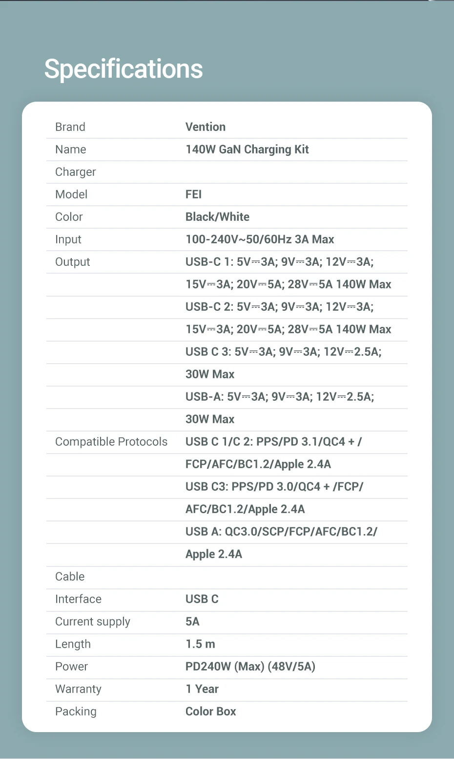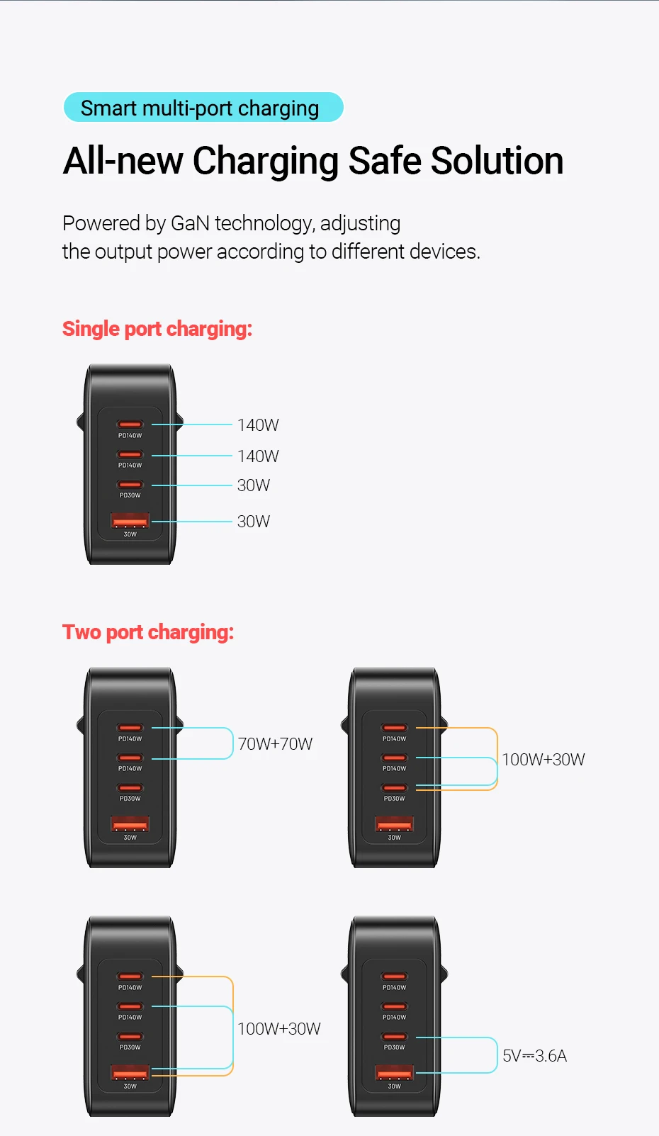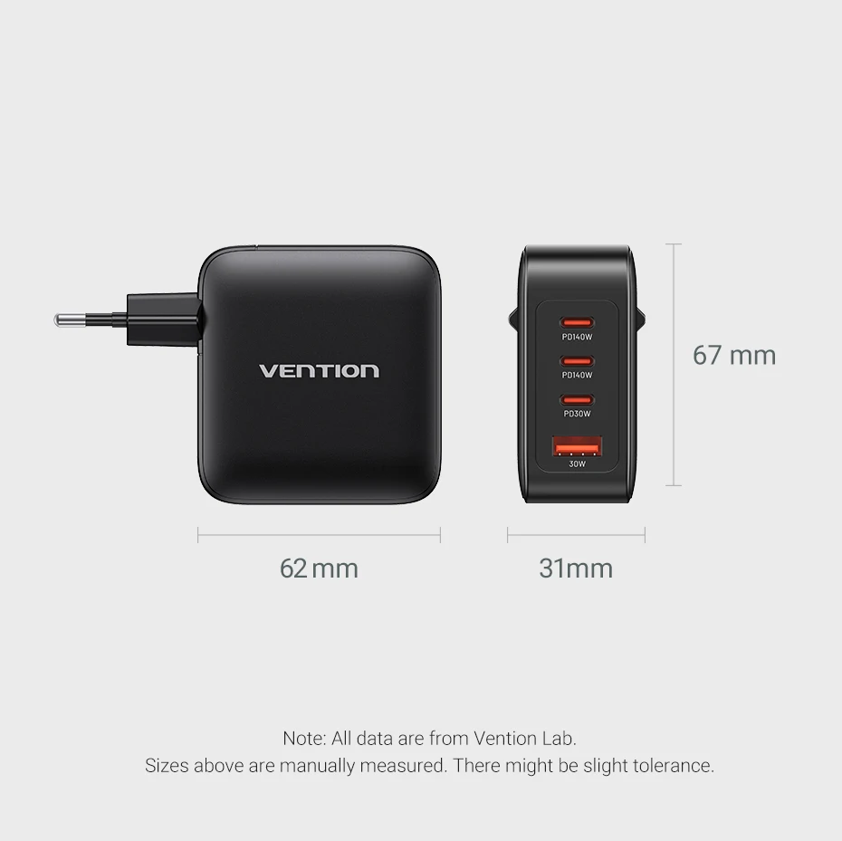 Bastante pequeño para un cargador de 4 puertos y 140W. Pero un poco pesado con 235 gramos. Probado con una salida de 95 vatios en C1 y C2, funciona perfectamente. ¡Recomendado!