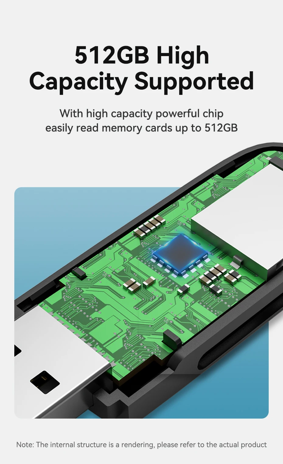 Con chip potente de alta capacidad, lee fácilmente tarjetas de memoria de hasta 512GB