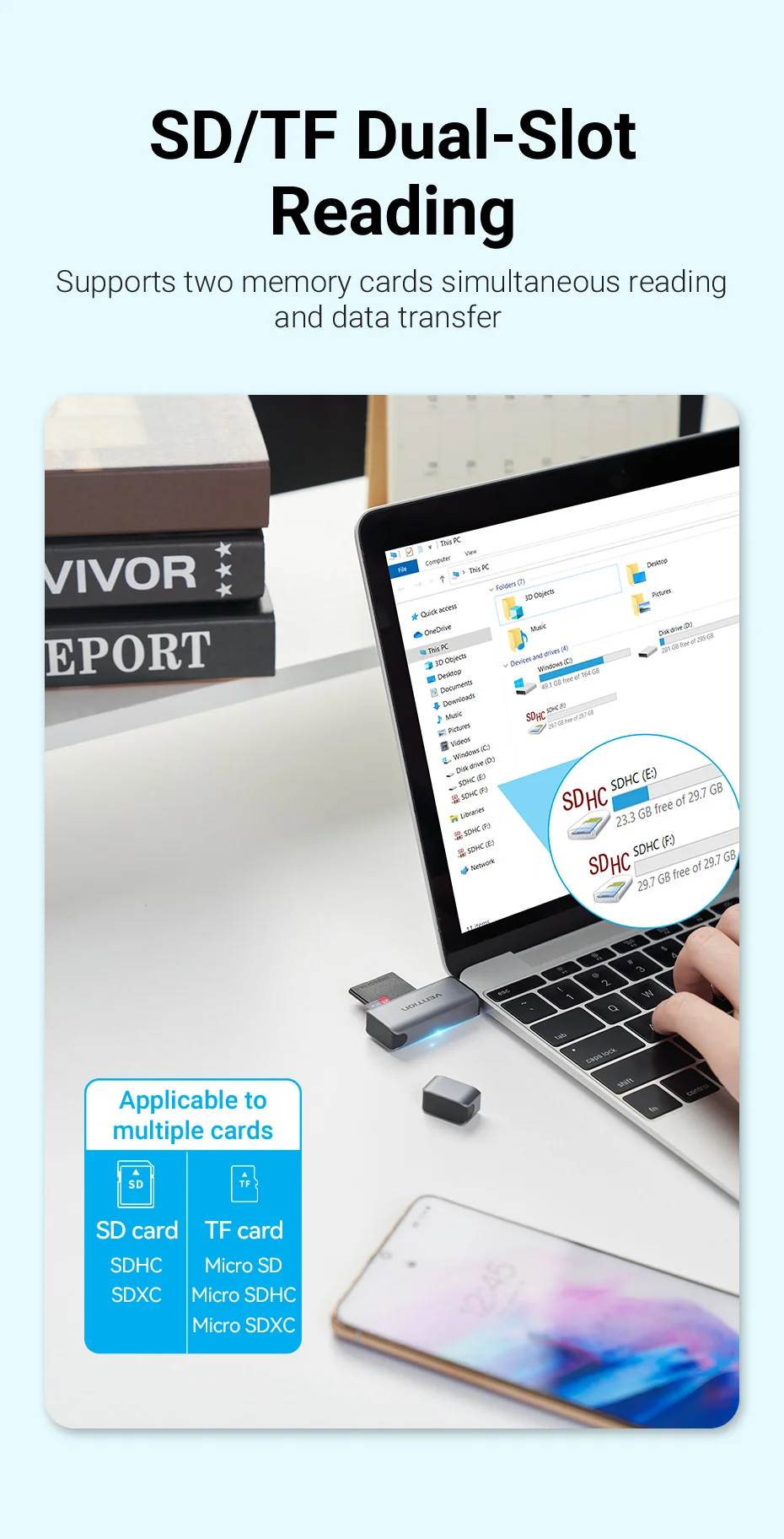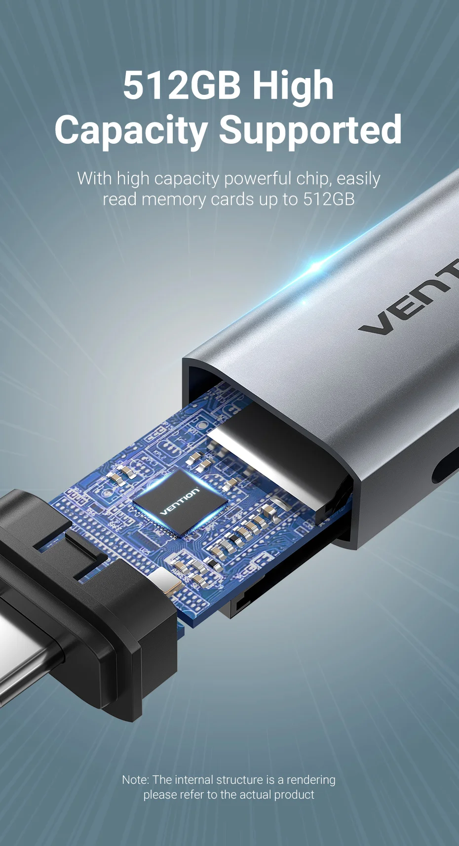 Con chip potente de alta capacidad, lee fácilmente tarjetas de memoria de hasta 512GB.