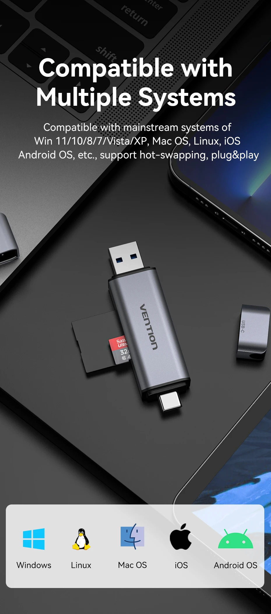 Compatible con sistemas convencionales de Win 11/ 10/8/7/Vista/XP,Mac OS,Linux,iOS,Android OS,etc. Supoort Hot Swapping, Plug & Play.