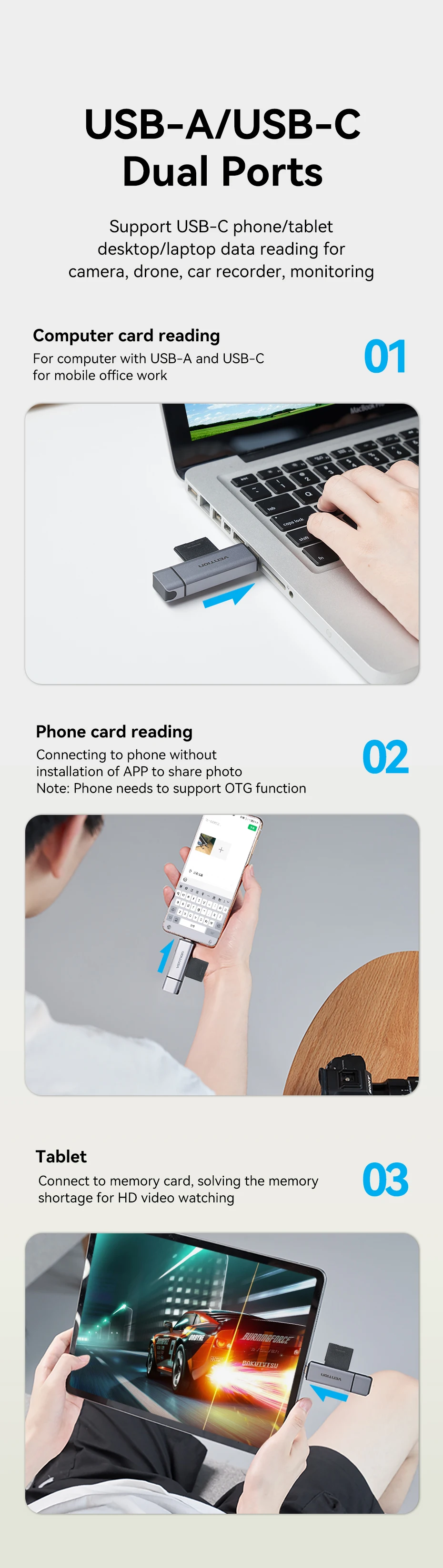 Admite lectura de datos de teléfono/teblet de escritorio/portátil para cámara, Dron, grabadora de coche, monitoreo