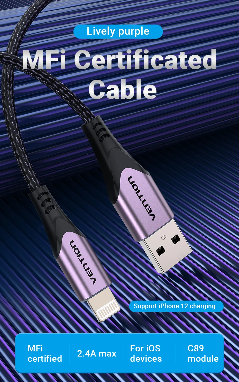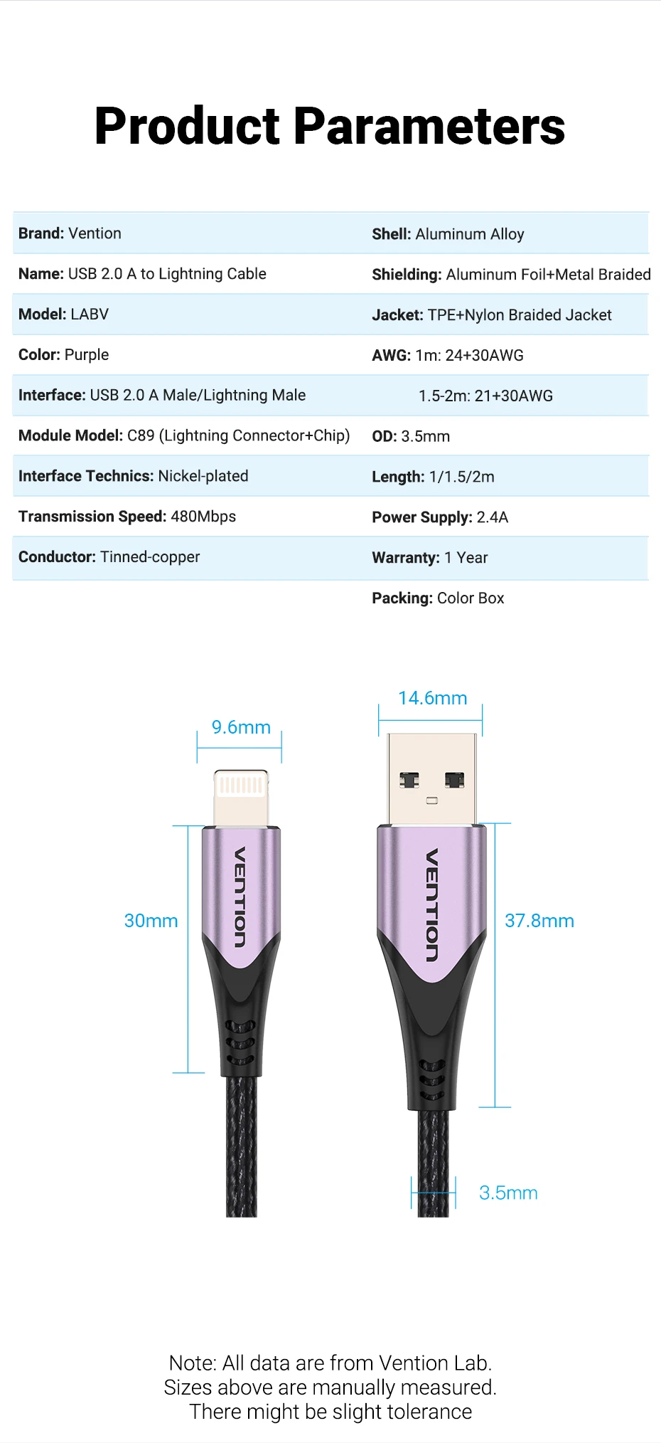 Nombre: Cable USB 2.0 A a LightningColor: PúrpuraInterfaz: USB2.0 A macho/hembraModelo de módulo: C89 (conector Lightning + chip)Técnicas de interfaz: niqueladoVelocidad de transmisión: 480 MbpsConductor: Cobre estañadoCarcasa: aleación de aluminioBlindaje: Papel de aluminio+Metal trenzadoChaqueta: TPE + chaqueta trenzada de nailon.AWG: 1m: 24+30AWG1,5-2 m: 21+30 AWG0D: 3,5 mmLongitud: 2m