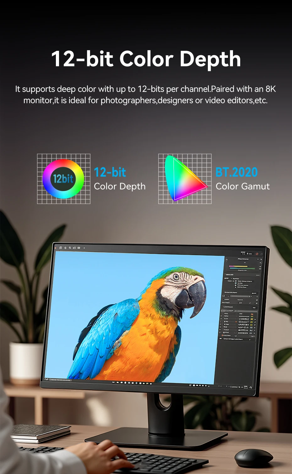 Admite colores profundos con hasta 12 bits por canal. Combinado con un 8K