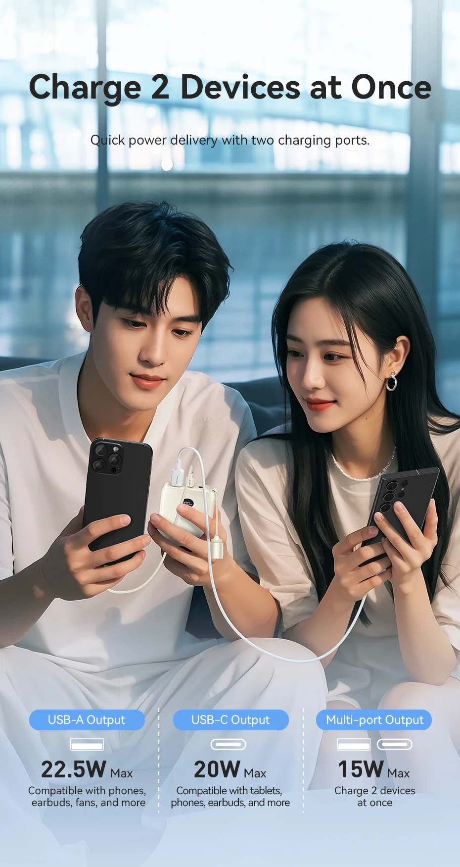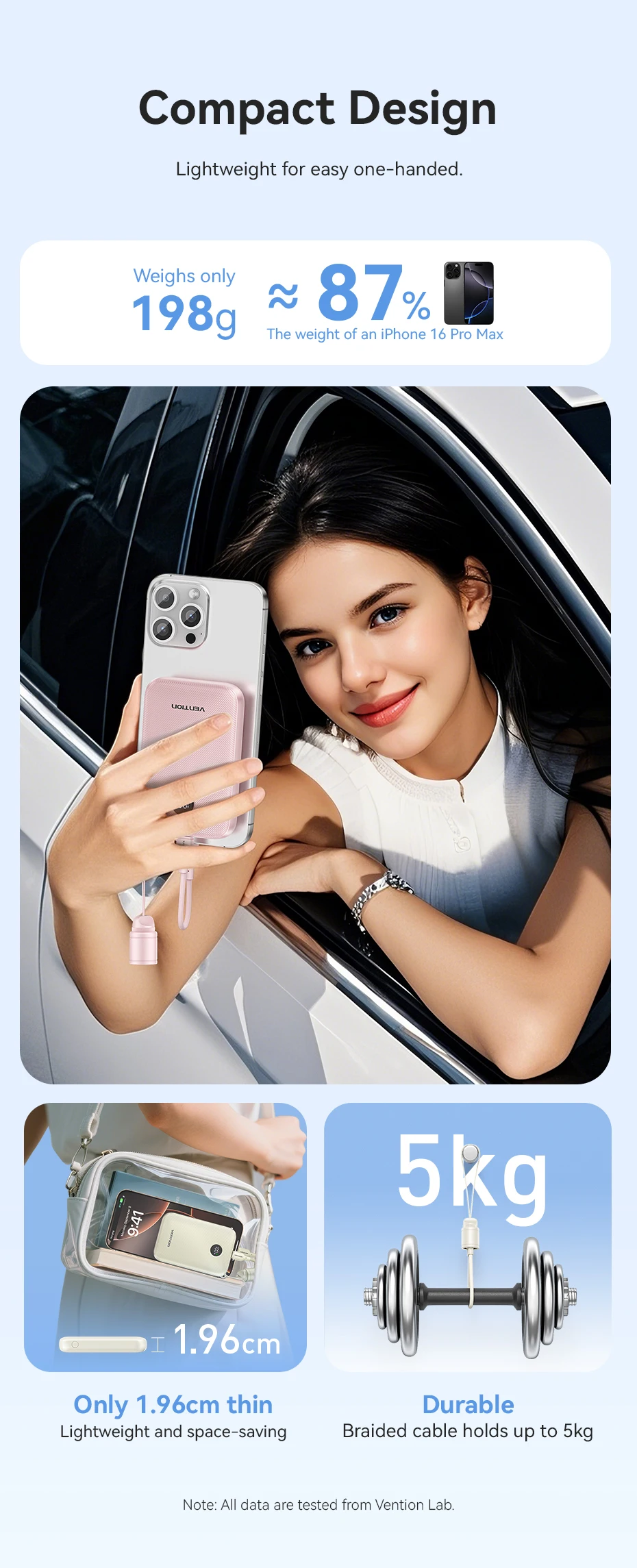 Su tamaño compacto y su carcasa de plástico liviana lo convierten en un cargador ultraportátil, perfecto para viajar.