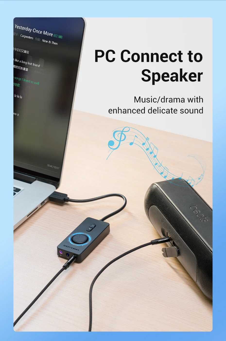 Conéctalo a auriculares/altavoces, etc., restaura la calidad del sonido original.