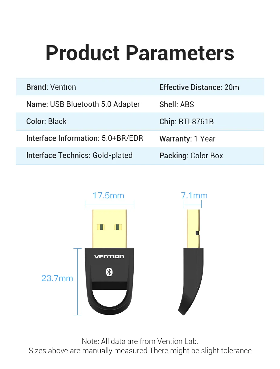 Vention Bluetooth USB para PC se conecta con auriculares o altavoces Bluetooth para transmisión inalámbrica de música estéreo. Además, tiene la capacidad de tomar Skype o llamadas telefónicas usando el micrófono de sus auriculares y usar el adaptador USB para transferir archivos de datos a/desde teléfonos móviles/tabletas.