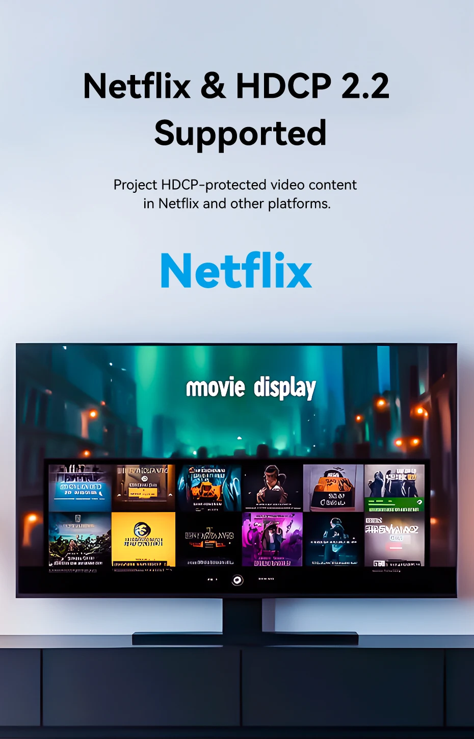 Proyecta contenido de vídeo protegido por HDCP en Netflix y otras plataformas.