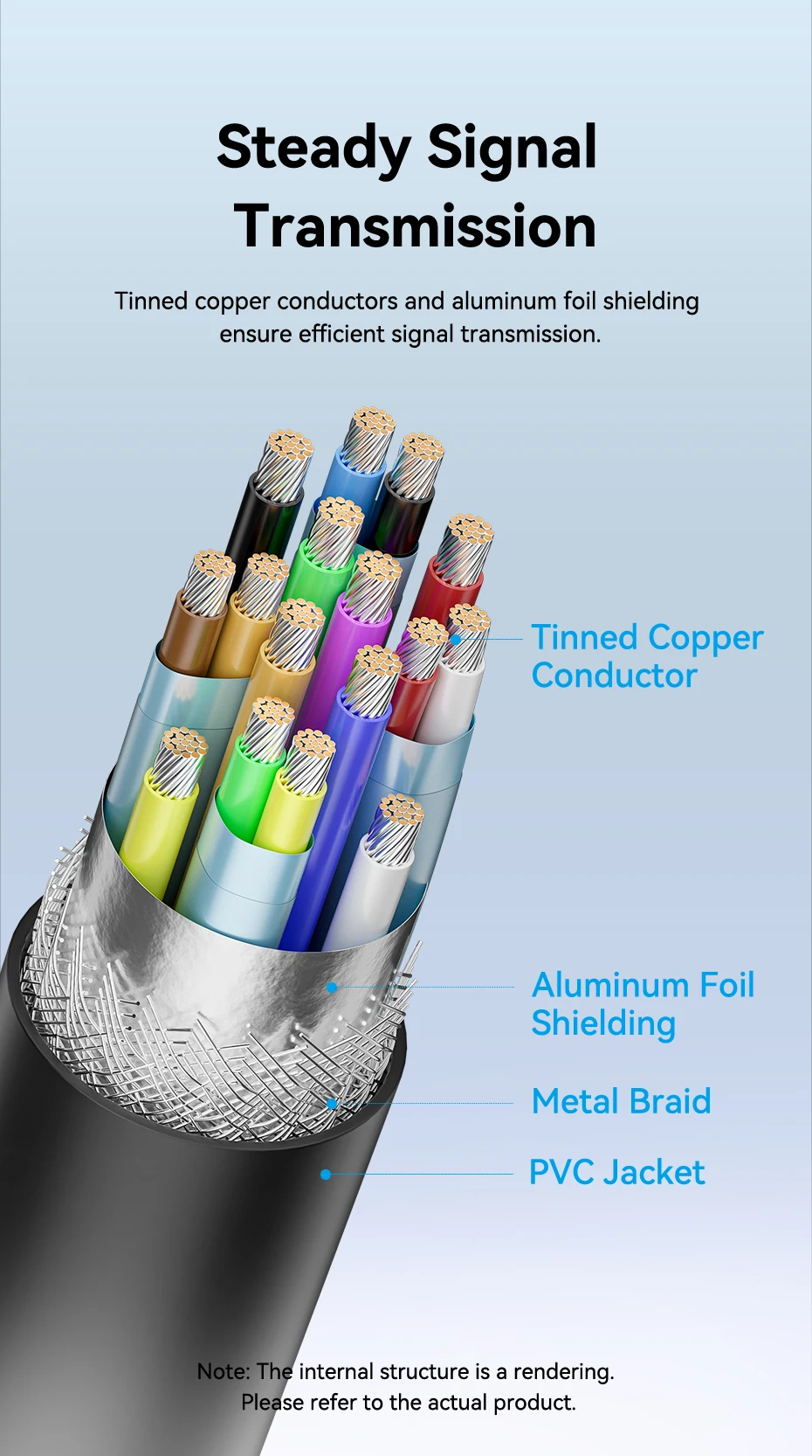 Los conductores de cobre estañado y el blindaje de papel de aluminio garantizan una transmisión de señal eficiente.