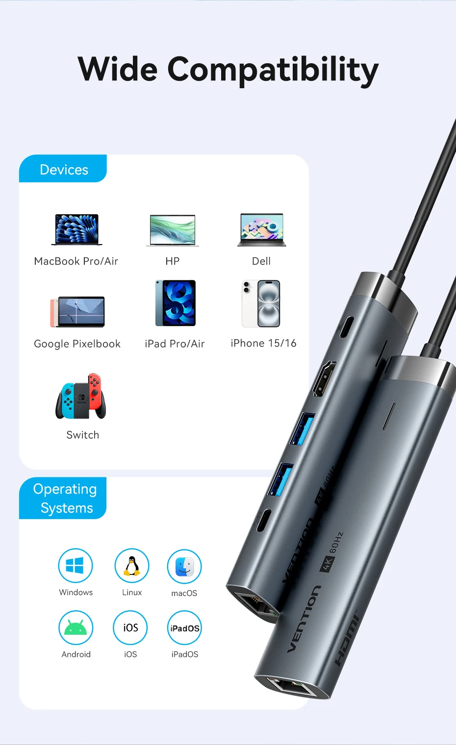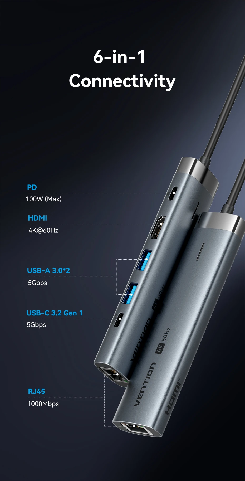 Comprar Vention USB C HUB 4K60Hz tipo C a HDMI RJ45 PD 100W adaptador para Macbook iPad Pro Air M2 M1 Sumsang accesorios de PC USB 3,0 HUB
