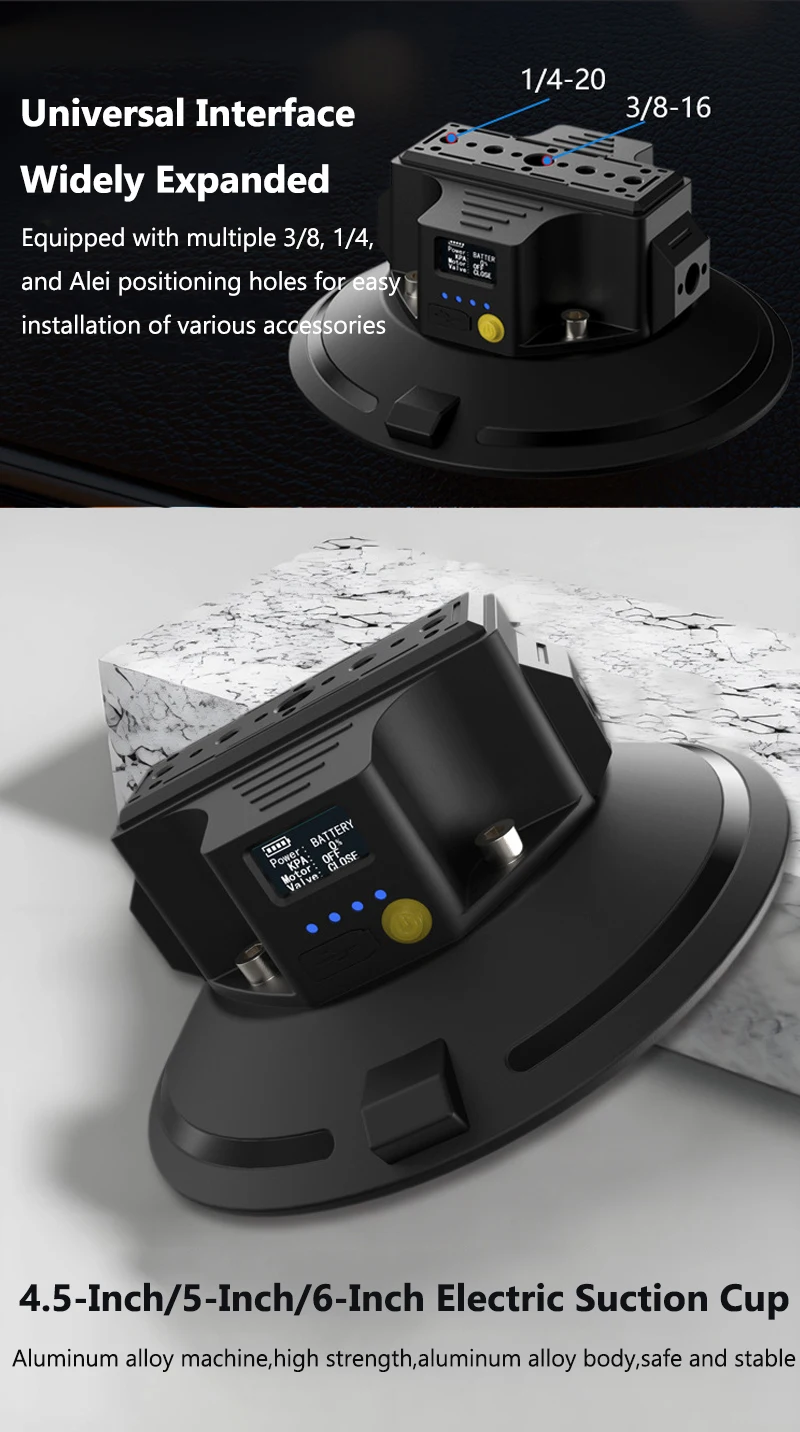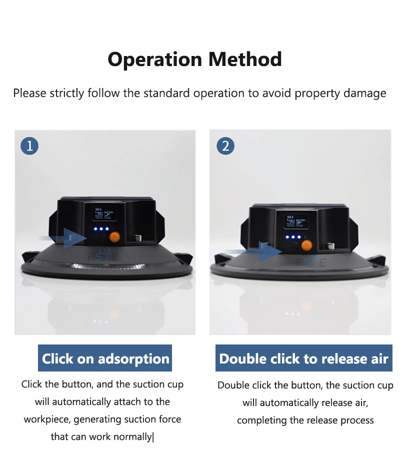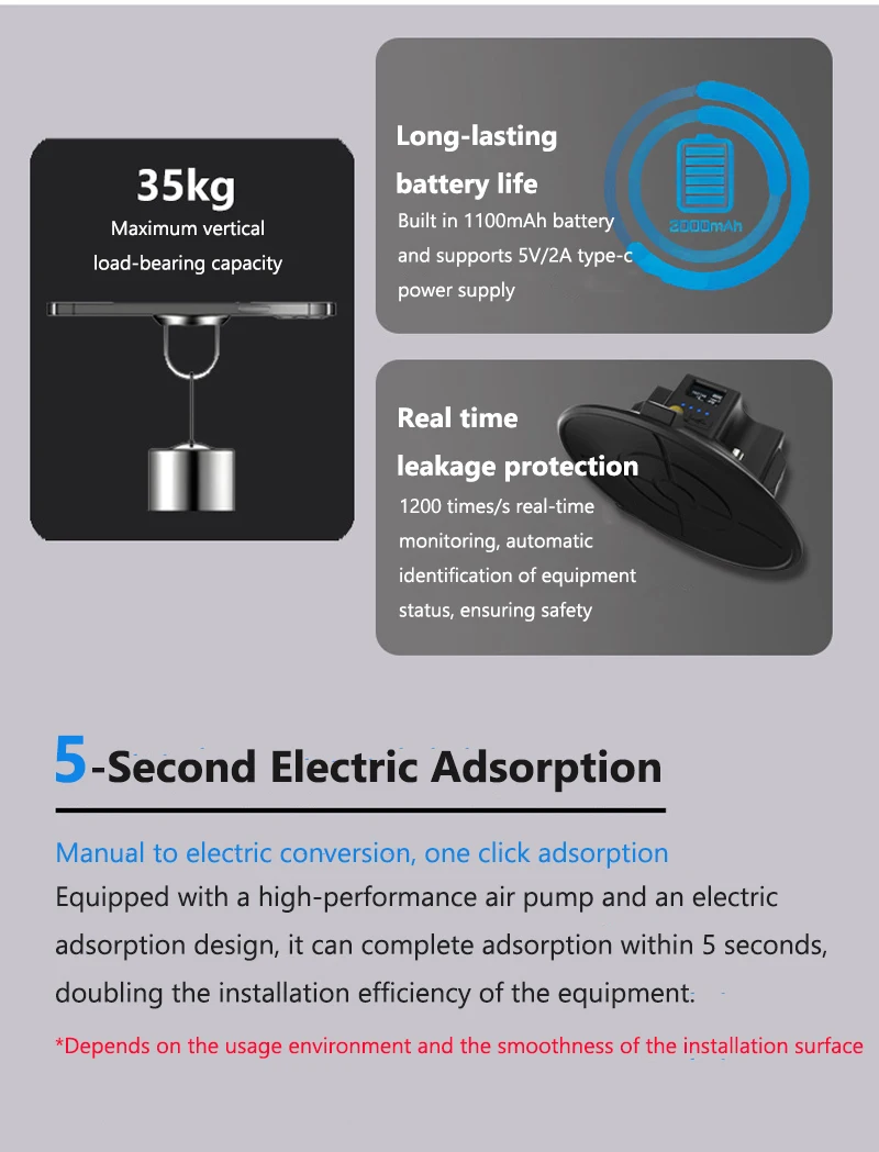 Características:* Adsorción rápida: bomba de aire incorporada de alto rendimiento, diseño de adsorción eléctrica, puede completar la adsorción en 5 segundos, duplicar la eficiencia de la instalación del equipo.(El tiempo específico depende del entorno de uso y del acabado de la superficie de instalación).