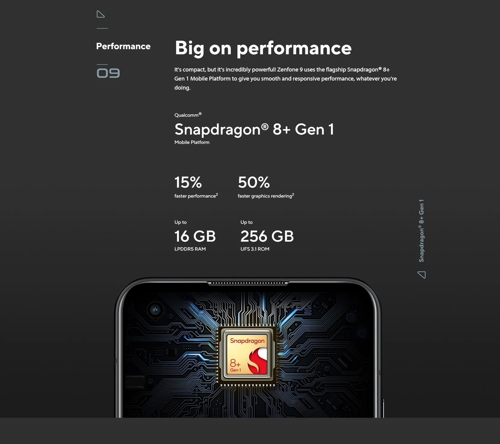 Es compacto, pero increíblemente potente. Zenfone 9 utiliza el buque insignia Snapdragon®Plataforma móvil 8 + Gen 1 para ofrecerte un rendimiento suave y sensible, sea lo que estés haciendo.