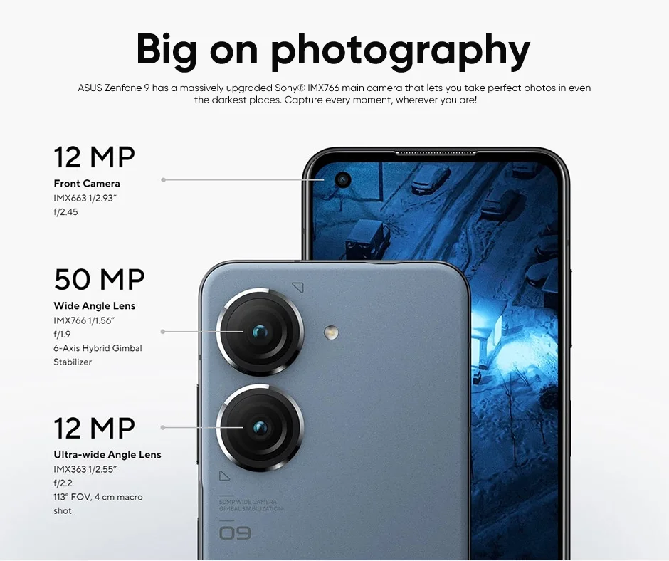 ASUS Zenfone 9 tiene un Sony ampliamente actualizado®Cámara principal IMX766 que te permite tomar fotos perfectas incluso en los lugares más oscuros. Captura cada momento, allá donde estés.