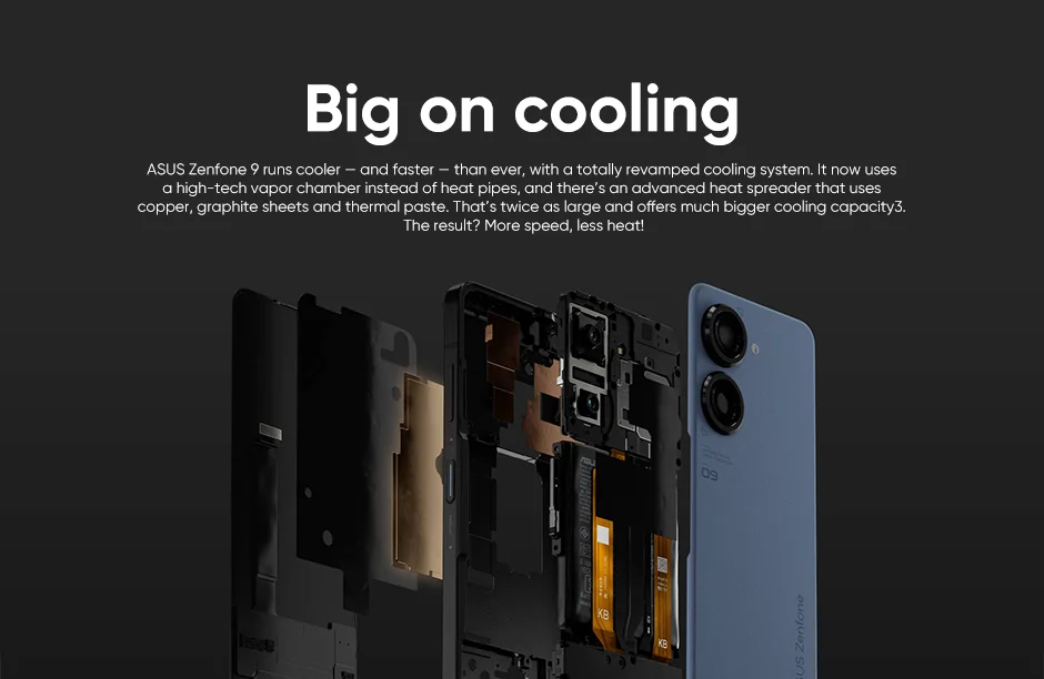 ASUS Zenfone 9 funciona más fresco y más rápido que nunca, con un sistema de refrigeración totalmente mejorado. Ahora utiliza una cámara de vapor de alta tecnología en lugar de tubos de calor, y hay un avanzado esparcidor de calor que utiliza cobre, láminas de grafito y pasta térmica. Eso es el doble de grande y ofrece una capacidad de refrigeración mucho mayor 3. ¿El resultado? ¡Más velocidad, menos calor!
