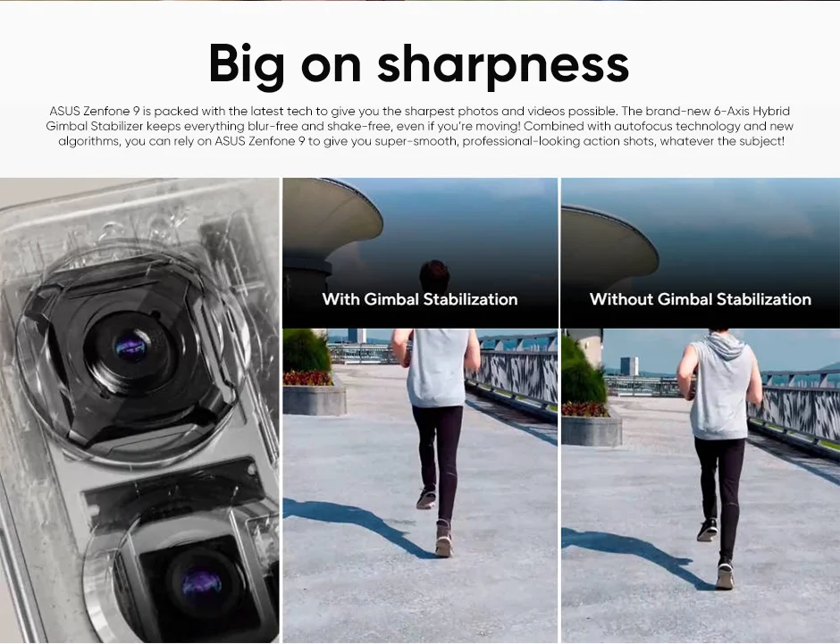 ASUS Zenfone 9 está embalado con la última tecnología para ofrecerte las fotos y vídeos más nítidos posibles. El nuevo estabilizador de cardán híbrido de 6 ejes mantiene todo libre de borrosidad y de vibraciones, ¡incluso si te mueves! Combinado con tecnología de autoenfoque y nuevos algoritmos, puedes confiar en ASUS Zenfone 9 para darte tomas de acción supersuaves y de aspecto profesional, ¡sea cual sea el tema!