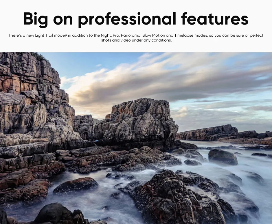Hay un nuevo modo Light Trail 9 Además de los modos Night, Pro, Panorama, Slow Motion y Timelapse, para que pueda estar seguro de tomas y videos perfectos bajo cualquier condición.