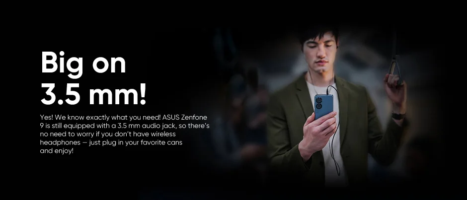 ¡Sí! ¡Sabemos exactamente lo que necesitas! ASUS Zenfone 9 todavía está equipado con un conector de audio de 3,5mm, por lo que no hay necesidad de preocuparse si no tiene auriculares inalámbricos, ¡Simplemente conecte sus latas favoritas y disfrute!