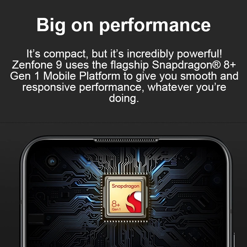 Es compacto, pero increíblemente potente. Zenfone 9 utiliza el buque insignia Snapdragon®Plataforma móvil 8 + Gen 1 para ofrecerte un rendimiento suave y sensible, sea lo que estés haciendo.