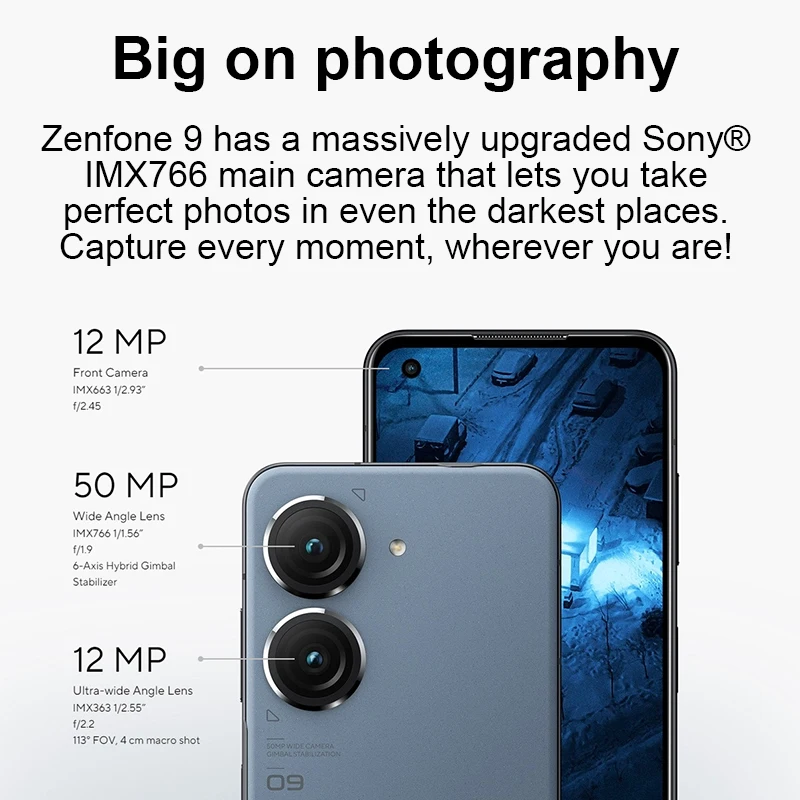 ASUS Zenfone 9 tiene un Sony ampliamente actualizado®Cámara principal IMX766 que te permite tomar fotos perfectas incluso en los lugares más oscuros. Captura cada momento, allá donde estés.