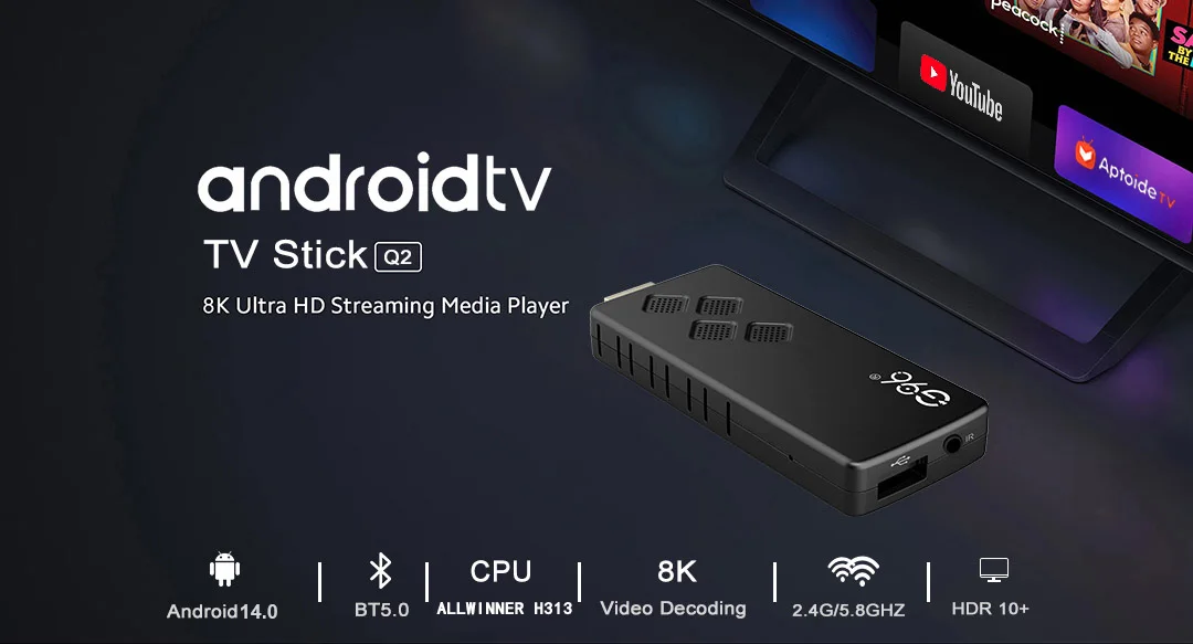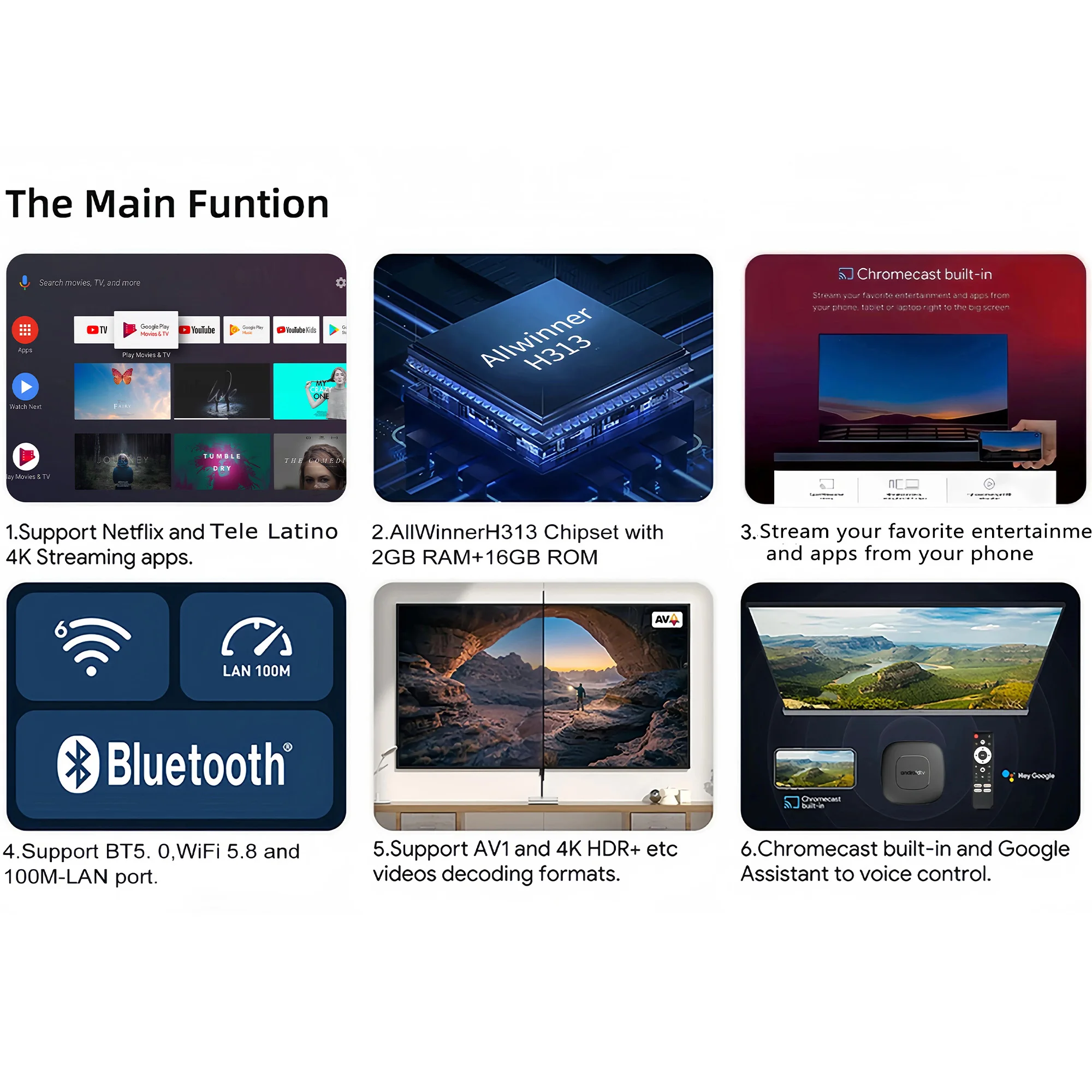 Funciona con el sistema operativo Android TV 13.0, compatible con una gran cantidad de aplicaciones y juegos, satisfaciendo sus diversas necesidades de entretenimiento.Admite WiFi de doble banda 2,4G/5G, conexión de red estable, admite Bluetooth 5.2, puede conectar periféricos.