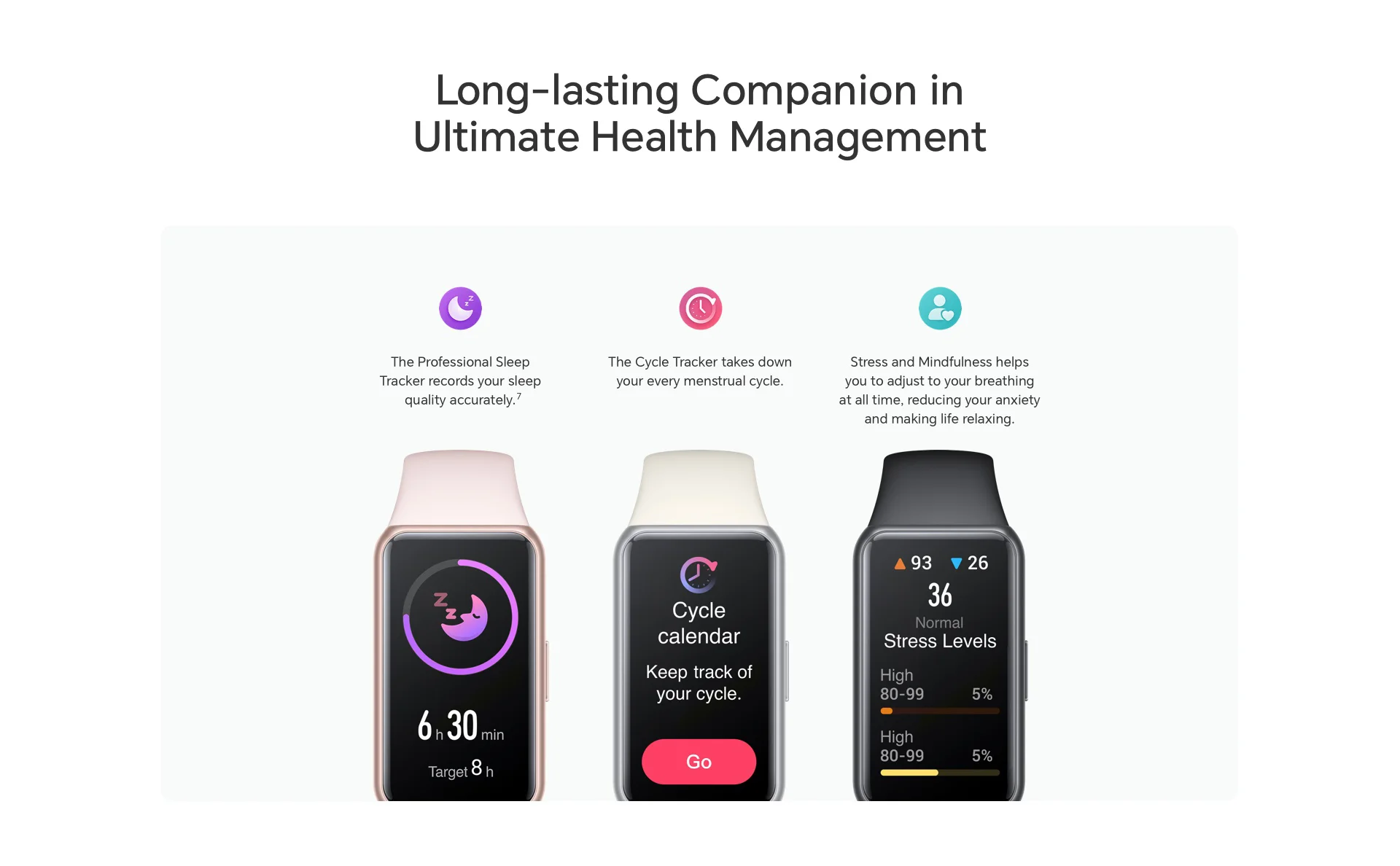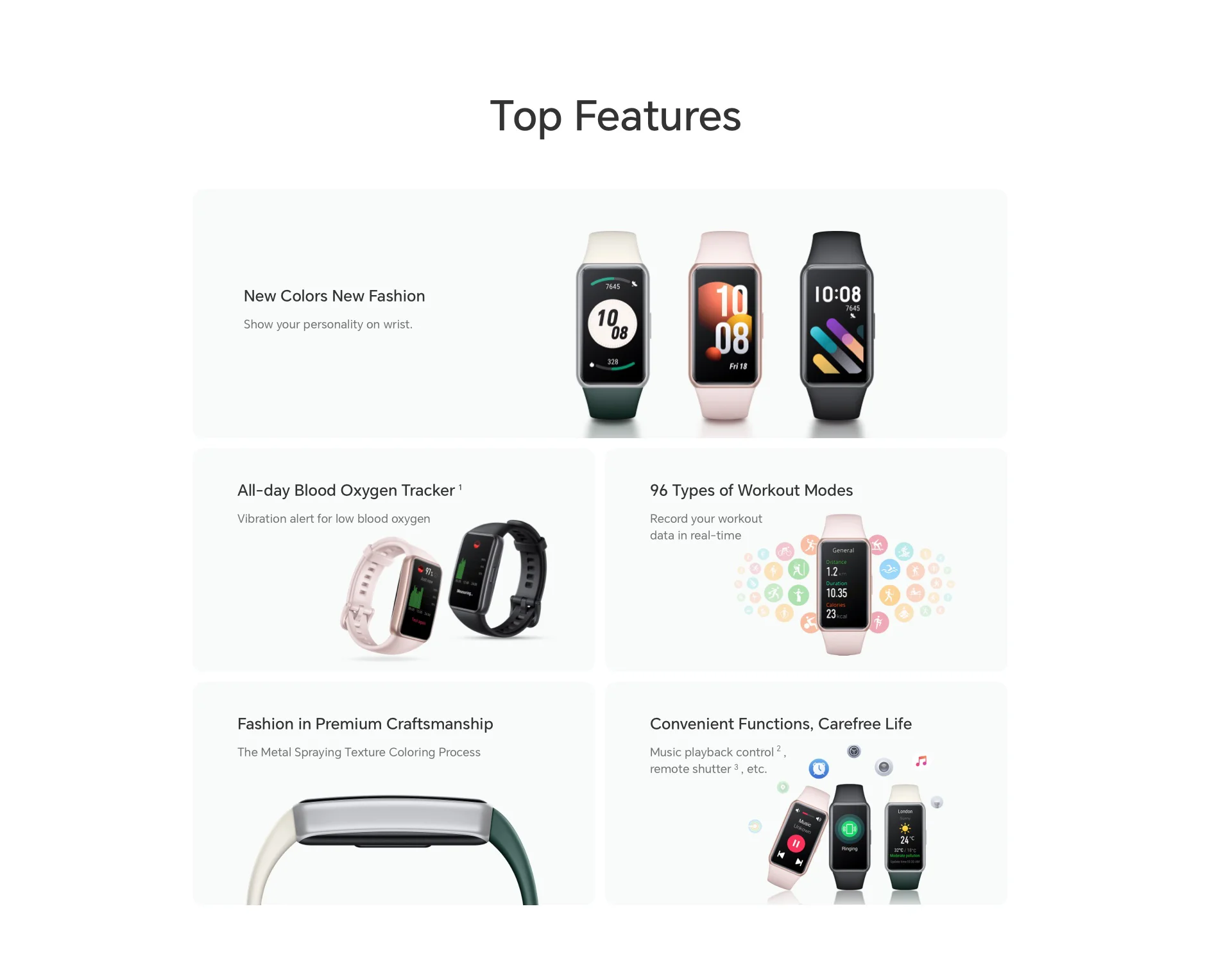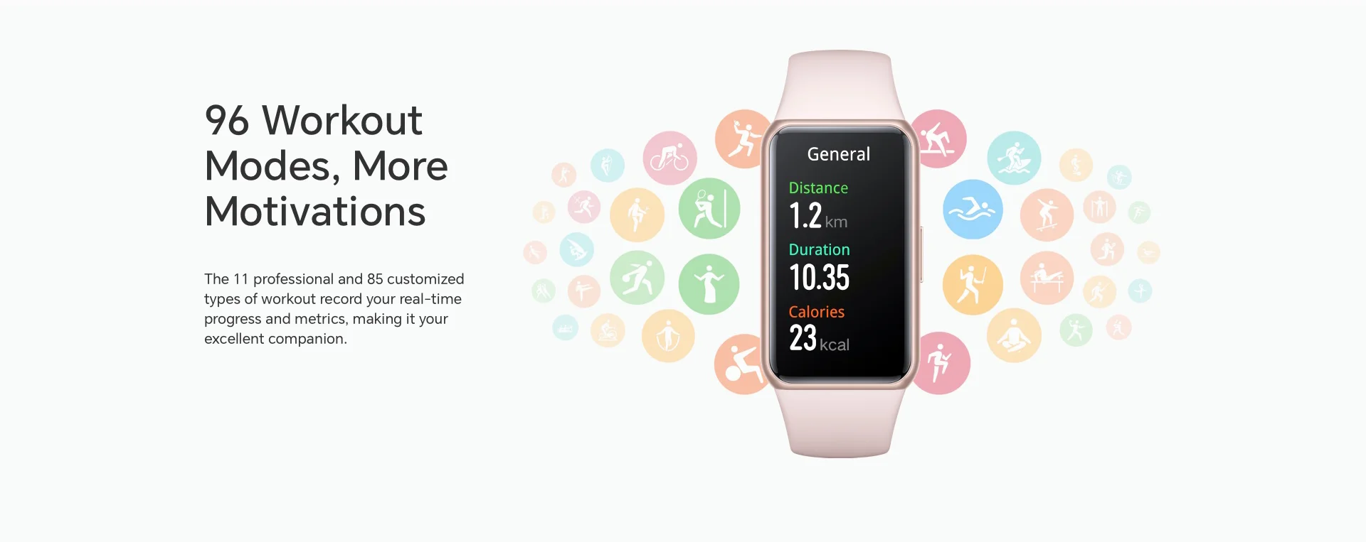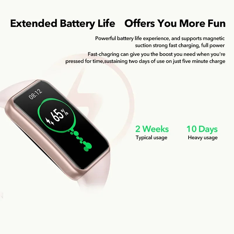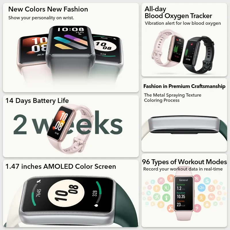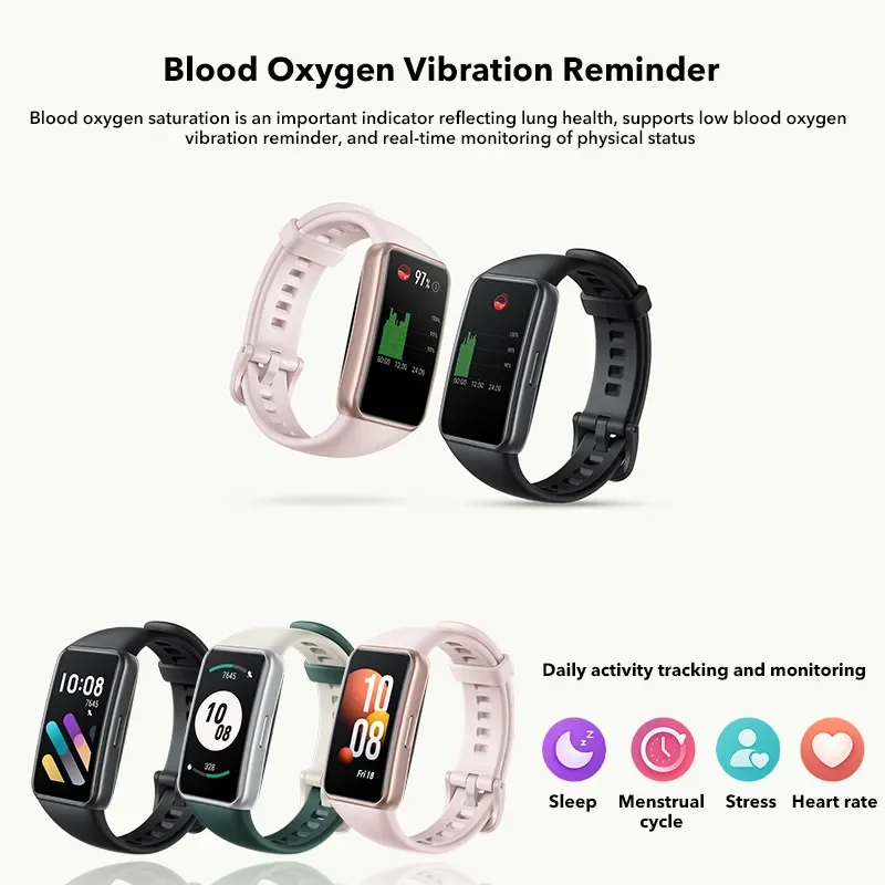 Función:Monitoreo de oxígeno en sangre durante todo el día (Japón, Corea, Taiwán (China) no son compatibles)Seguimiento y monitorización de la actividad diaria,Monitorización del ritmo cardíaco,Seguimiento del sueño, Detección de uso, almacenamiento y sincronización de datos, recordatorios, notificación de llamadas entrantes, recordatorio de mensajes,Recordatorio de la frecuencia cardíaca en reposo, 96 modos deportivos