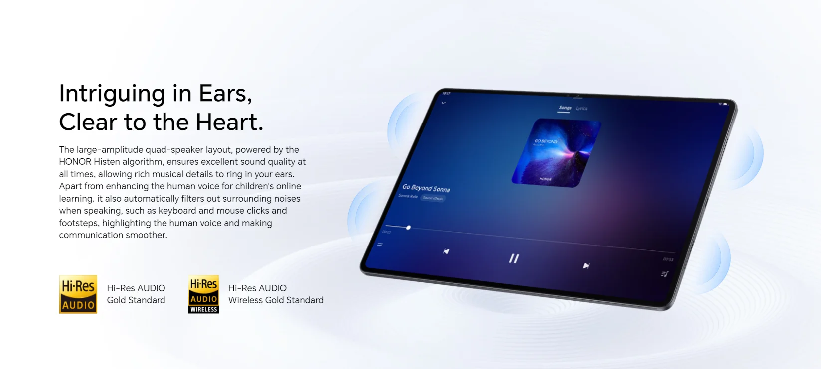 El diseño de altavoces cuádruples de gran amplitud, alimentado por el algoritmo HONOR Histen, garantiza una excelente calidad de sonido en todo momento, permitiendo que los ricos detalles musicales suenen en sus oídos. Además de mejorar la voz humana para el aprendizaje en línea de los niños. También filtra automáticamente los ruidos circundantes al hablar, como los clics y los pasos del teclado y el ratón, resaltando la voz humana y haciendo que la comunicación sea más fluida.