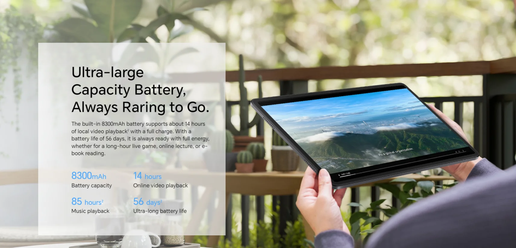La batería incorporada de 8300mAh admite aproximadamente 14 horas de reproducción de video local2 con una carga completa. Con una duración de la batería de 56 días, siempre está listo con toda la energía, ya sea para un juego en vivo de larga hora, conferencia en línea o lectura de libros electrónicos.