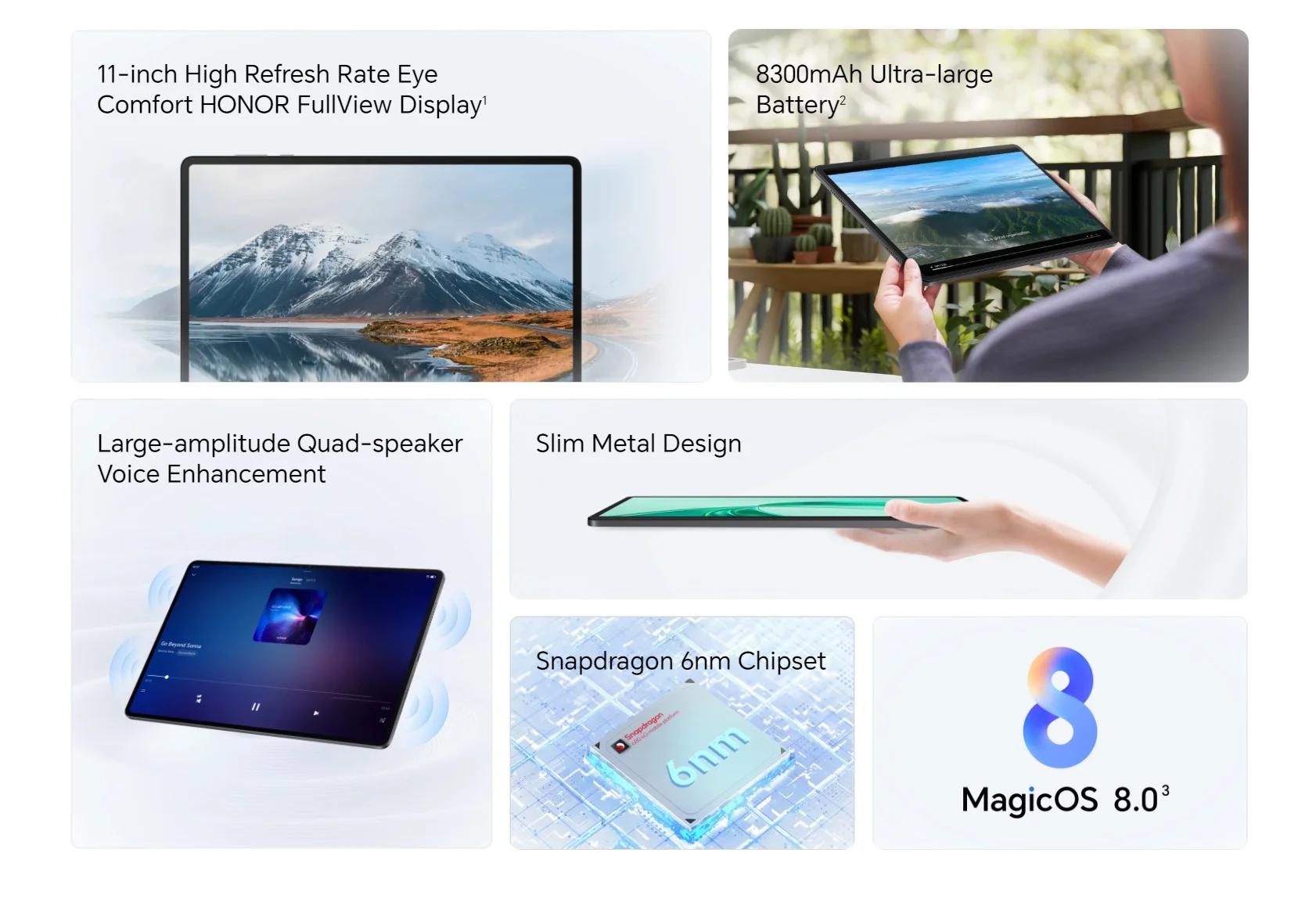 Los datos provienen del laboratorio HONOR. Con un diseño de esquinas redondeadas en la pantalla, la longitud diagonal de la pantalla es de 11 pulgadas cuando se mide de acuerdo con el rectángulo estándar. El área visible real es ligeramente más pequeña.