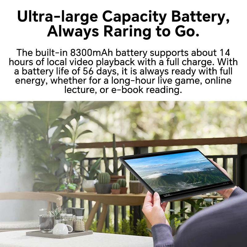 La batería incorporada de 8300mAh admite aproximadamente 14 horas de reproducción de video local2 con una carga completa. Con una duración de la batería de 56 días, siempre está listo con toda la energía, ya sea para un juego en vivo de larga hora, conferencia en línea o lectura de libros electrónicos.