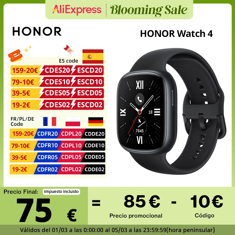 Comprar Versión Global HONOR Watch 4 Reloj Inteligente 5ATM Monitor de Oxígeno en Sangre BT5.2 GPS Bluetooth 5.2 Hasta 14 Días de Batería Larga