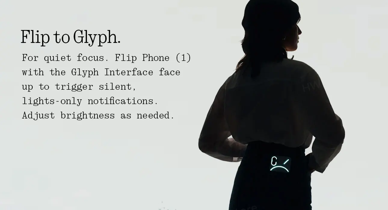 Para un enfoque silencioso. Teléfono abatible (1) con la interfaz Glyph boca arriba para activar notificaciones silenciosas y luminosas. Ajuste el brillo según sea necesario.