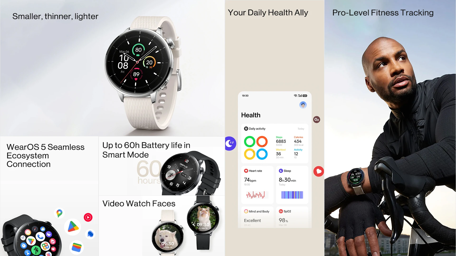 Menor, más delgado, más ligero| Hasta 60 horas de duración de la batería en modo inteligente| Seguimiento de actividad física Pro-Level| Esferas de visualización de vídeo| Conexión de ecosistema sin interrupciones WearOS 5| Tu aliado de salud diario